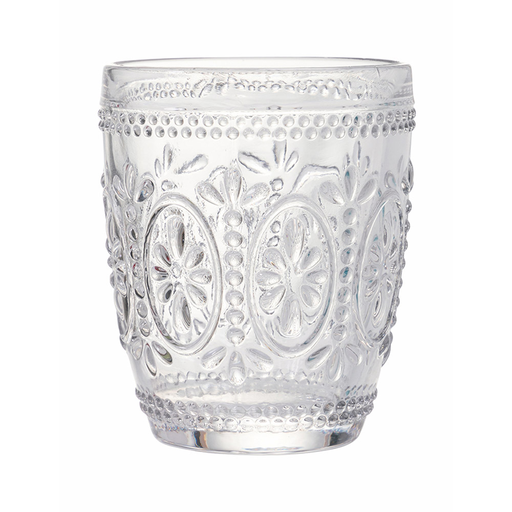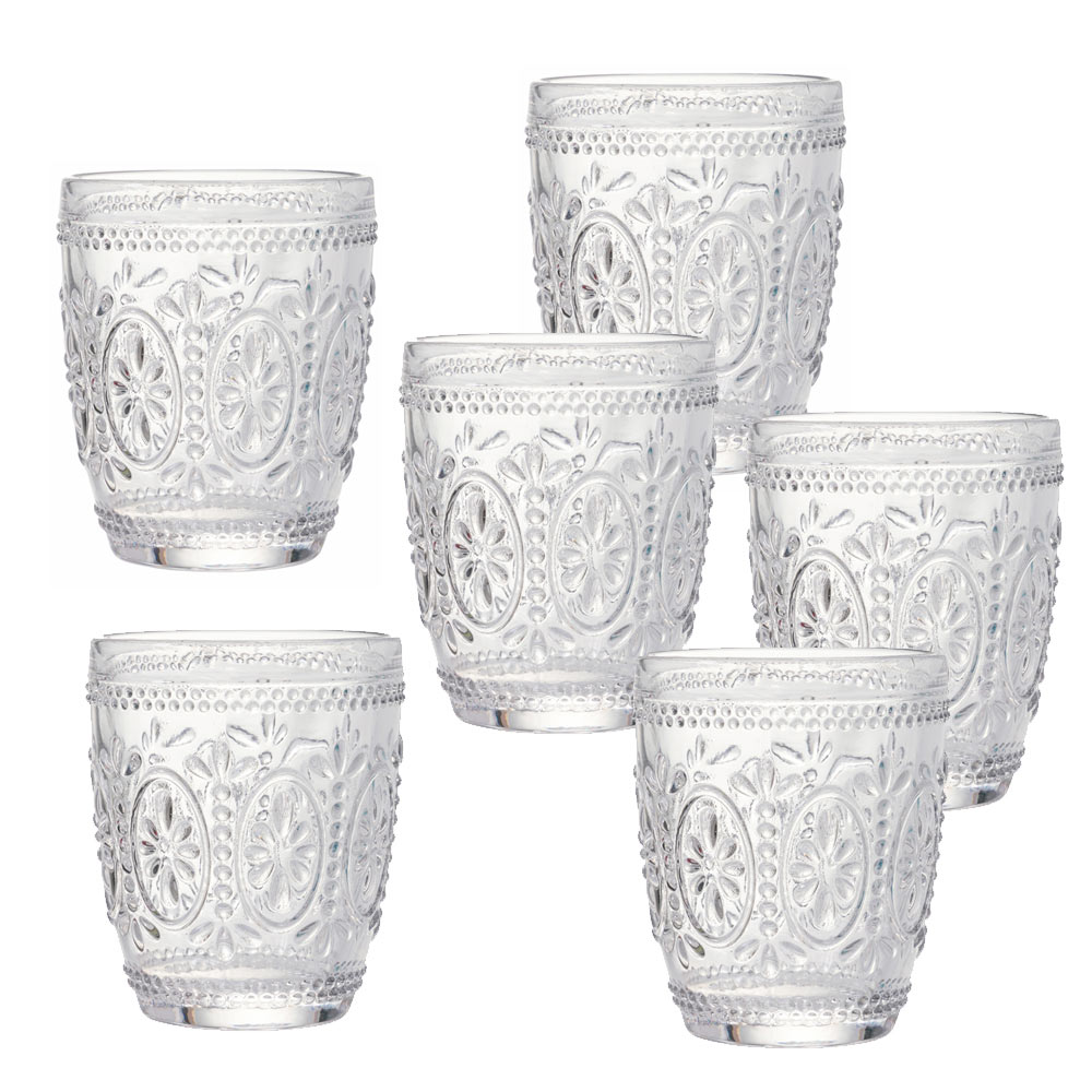 Uppsättning glas för vatten i transparent glas och barockdekorationer, 12 st.