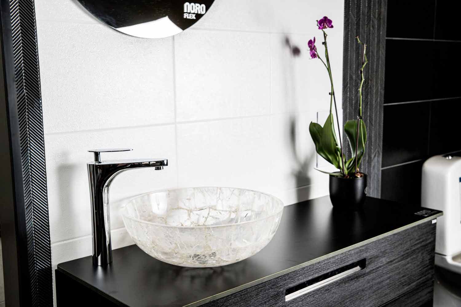 Baceno är ett underbart tvättställ för bänkskivor gjord av halvädelsten som transparent bergkristall.