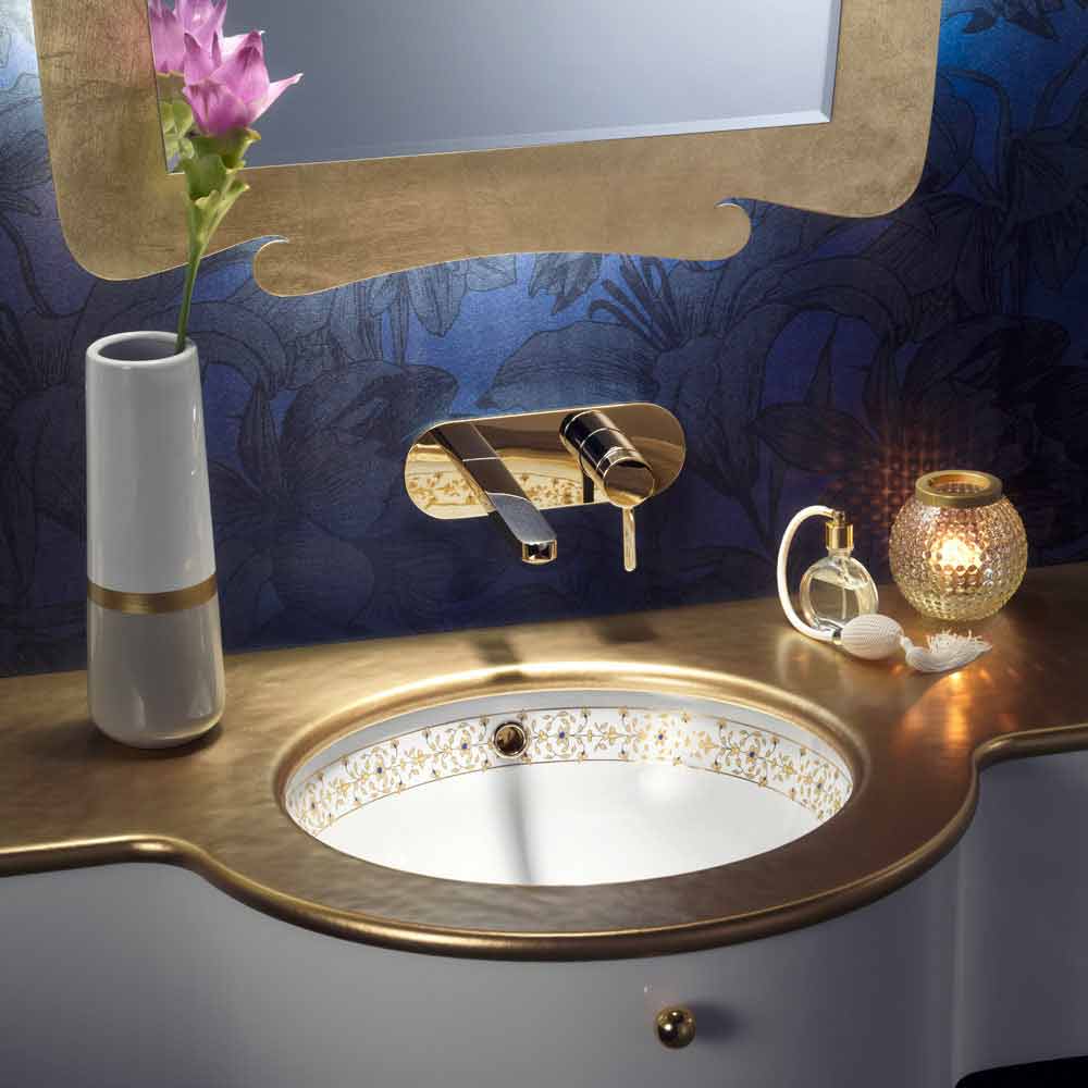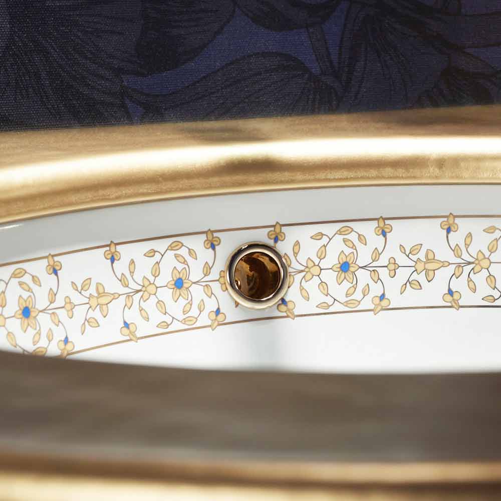 Badrum inbyggd handfat handgjord i Italien i brandlera, med rand med blått blommig dekoration och 24k guld.