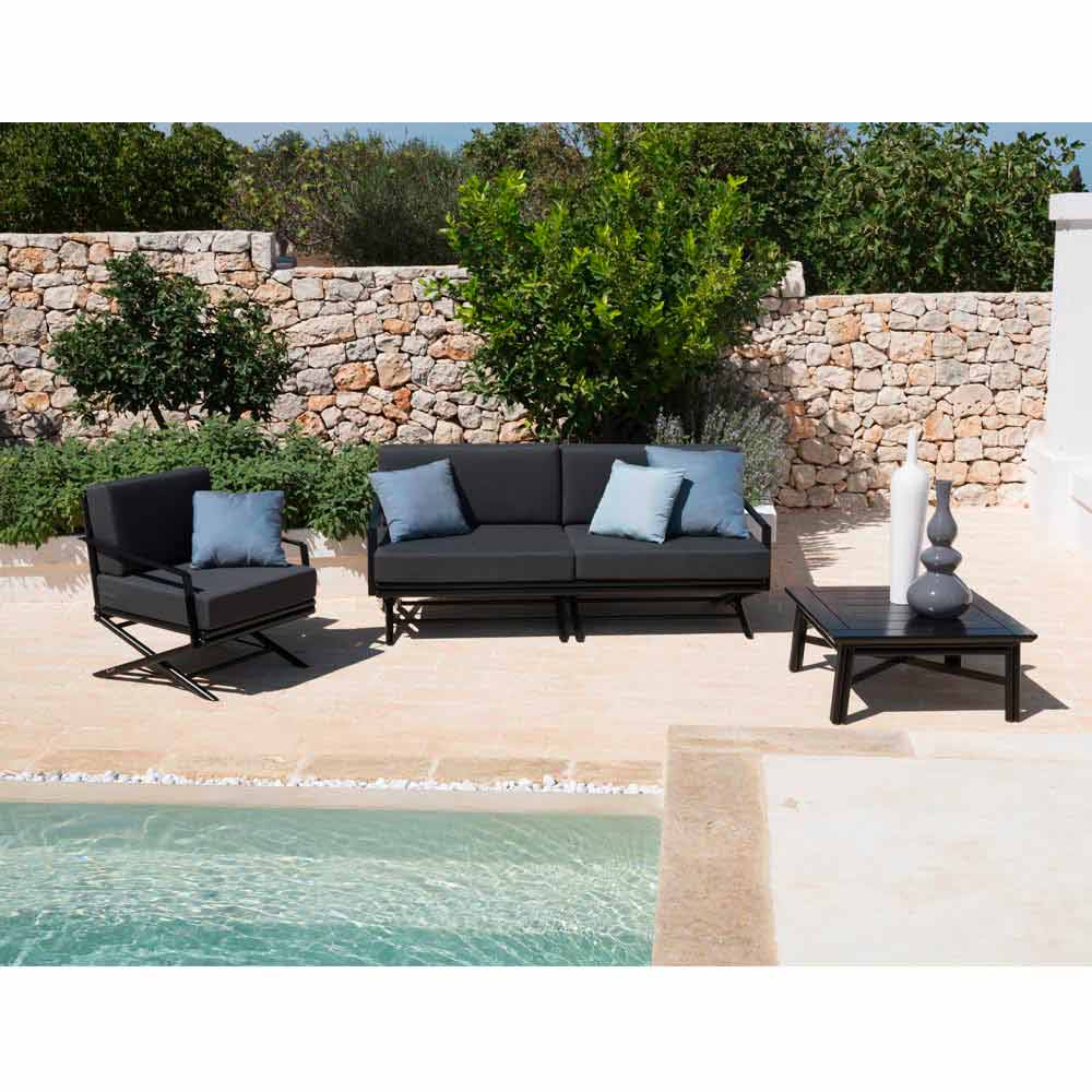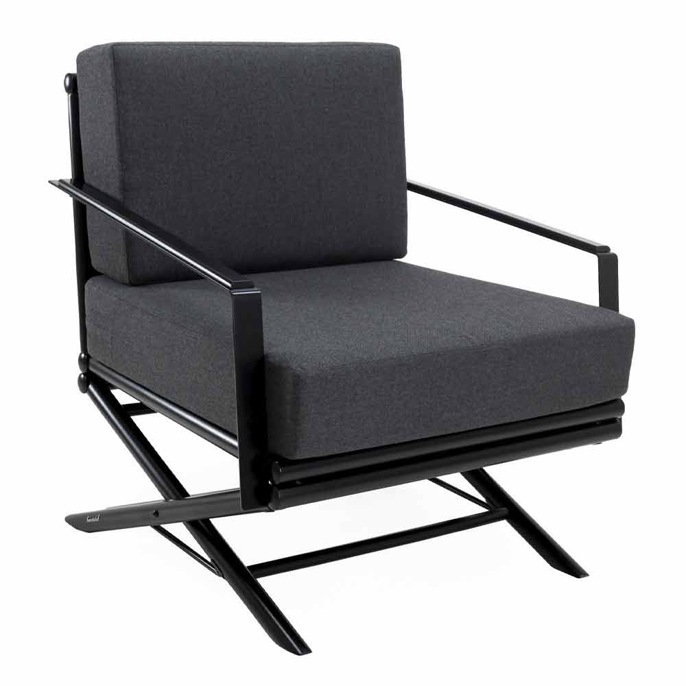 Koppla av fåtölj för utomhusbruk med naturlig eller svart träkonstruktion, batylinsits och tygkuddar, lyx tillverkad i Italien.