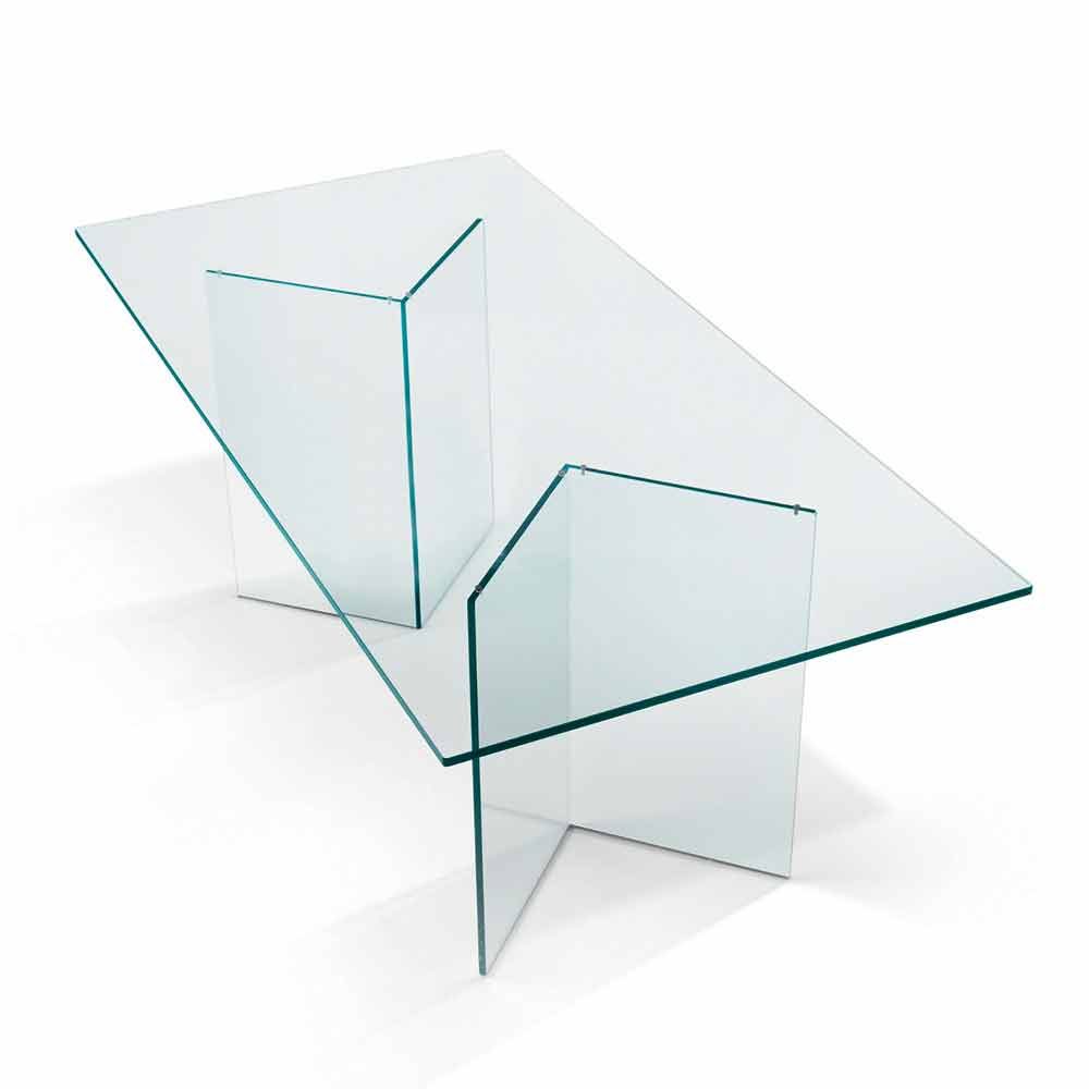 Detta rektangulära matbord är helt tillverkat av extra klart glas med en struktur som består av två glasstöd som kan placeras parallellt eller speglande beroende på användning.