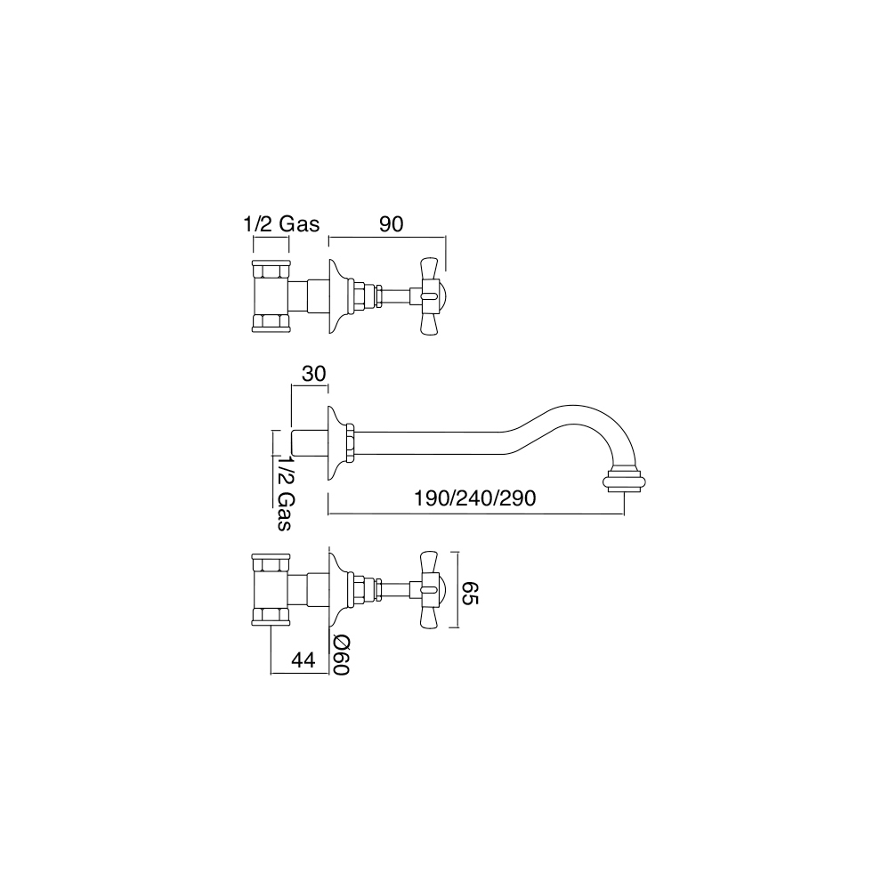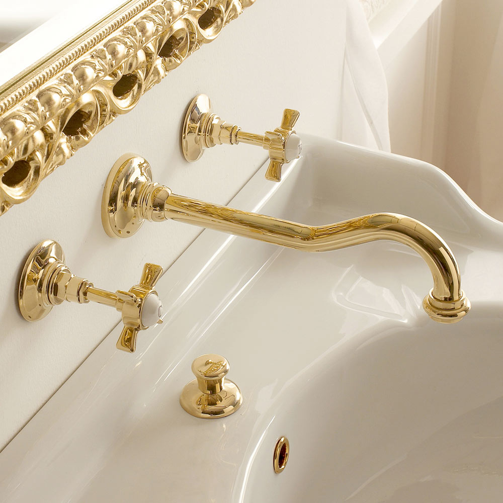 Väggmonterad kran för tvättställ eller diskbänk i mässing Katerina, tillverkad i Italien.