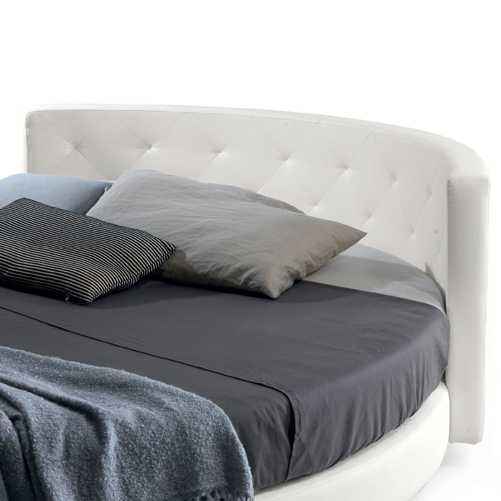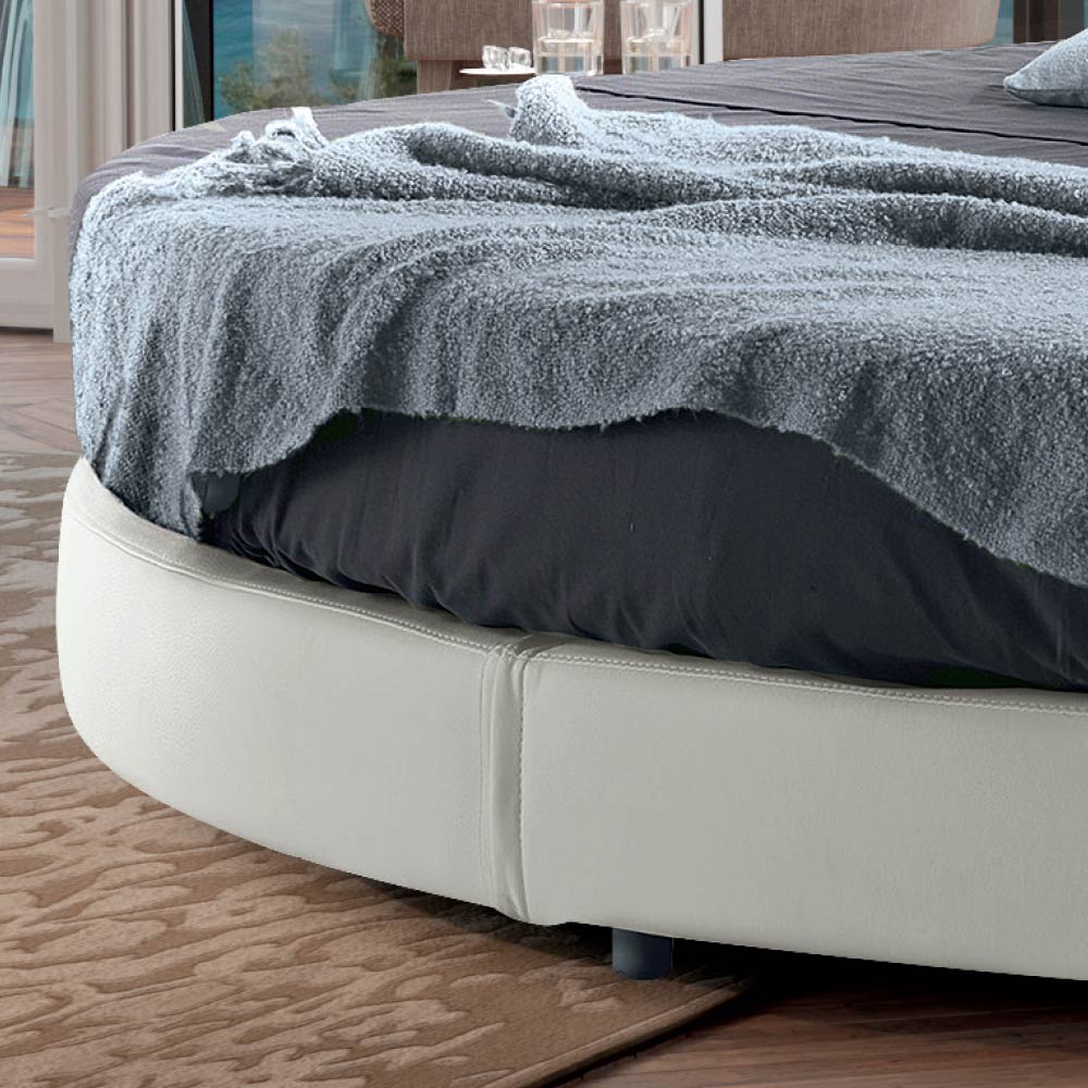 Rund dubbelsäng tillverkad i Italien, vadderad och klädd i eko-läder.