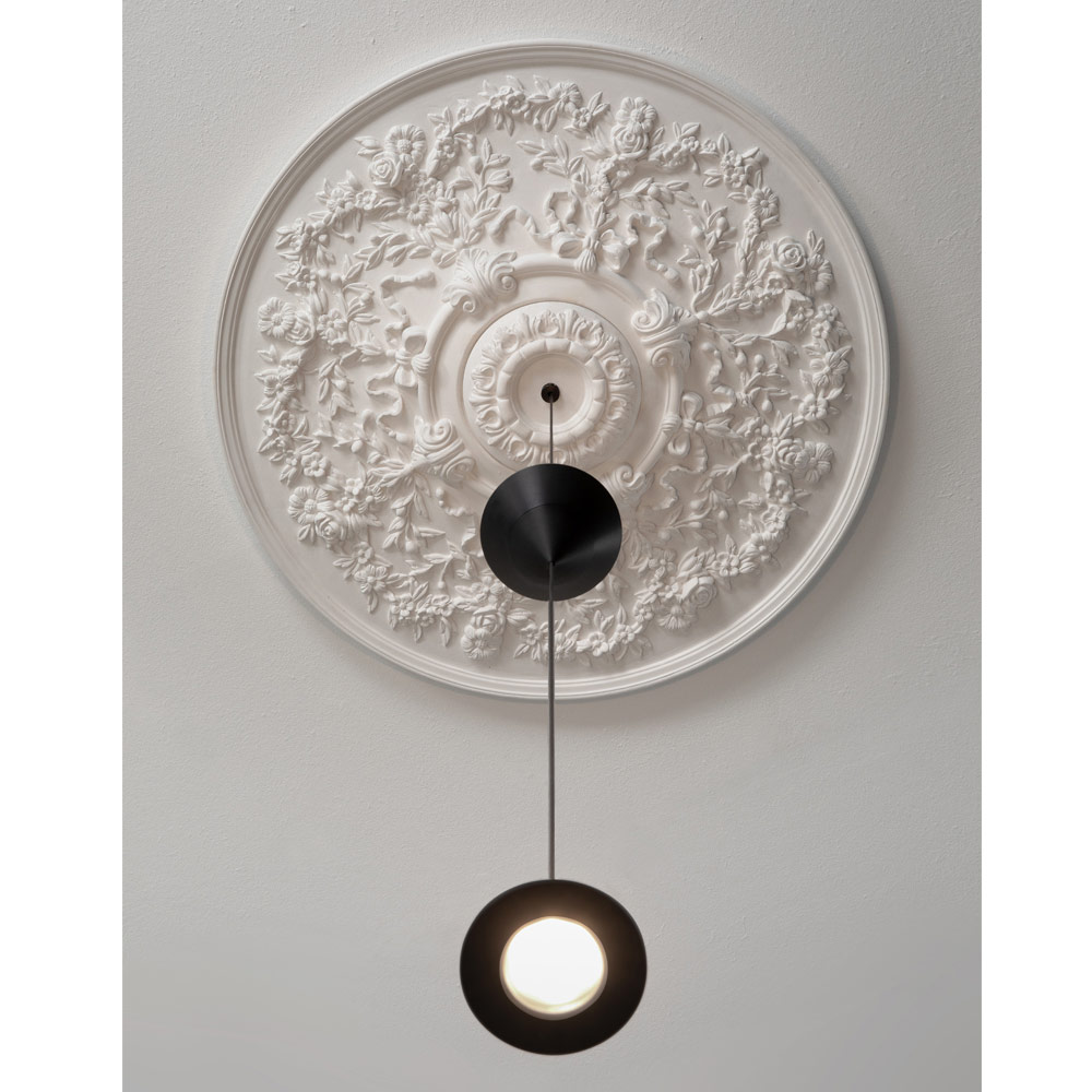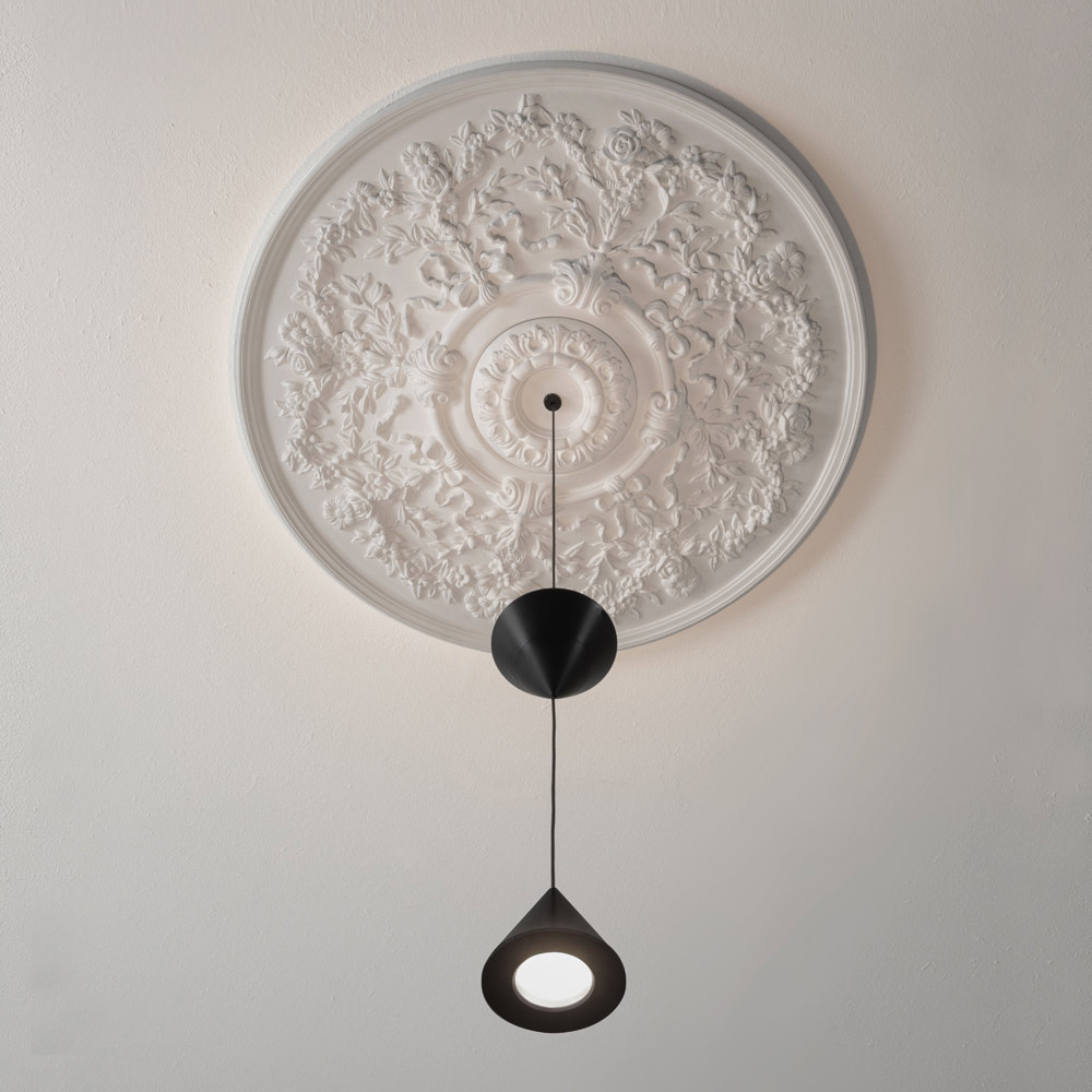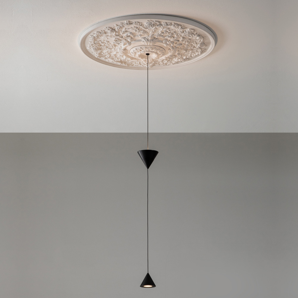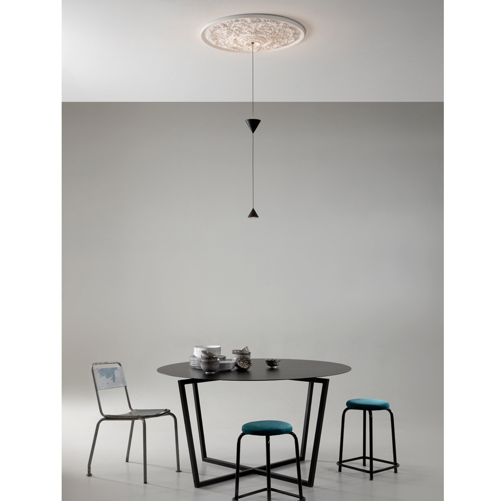 Lampan är gjord med en gips- och aluminiumstruktur för en helt italiensk design som genom okonventionella experiment och kontinuerlig forskning mellan tradition och modernitet kan förvåna, våga och upphetsa, vilket gör att du kan uttrycka dina känslor genom en originell och personlig dekorativ användning av ljus.