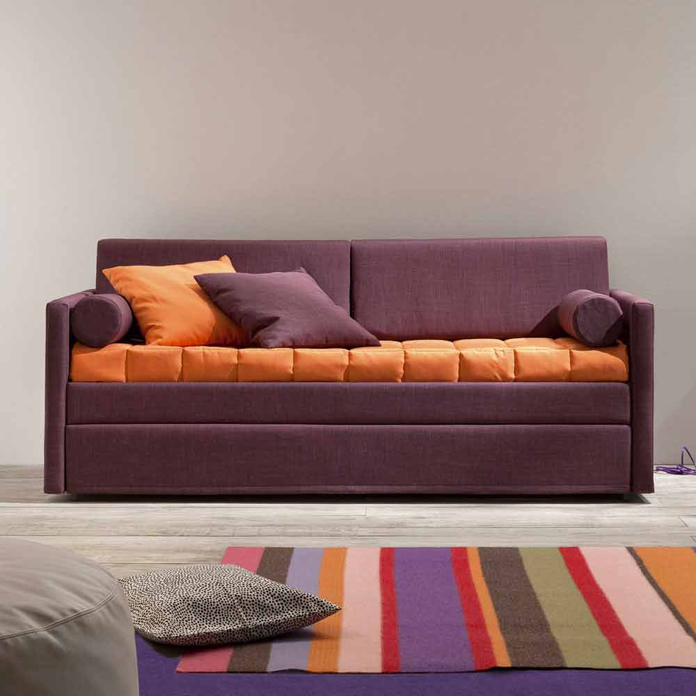 Bäddsoffa i våningssäng täckt av vinrött tyg tillverkat i Italien.