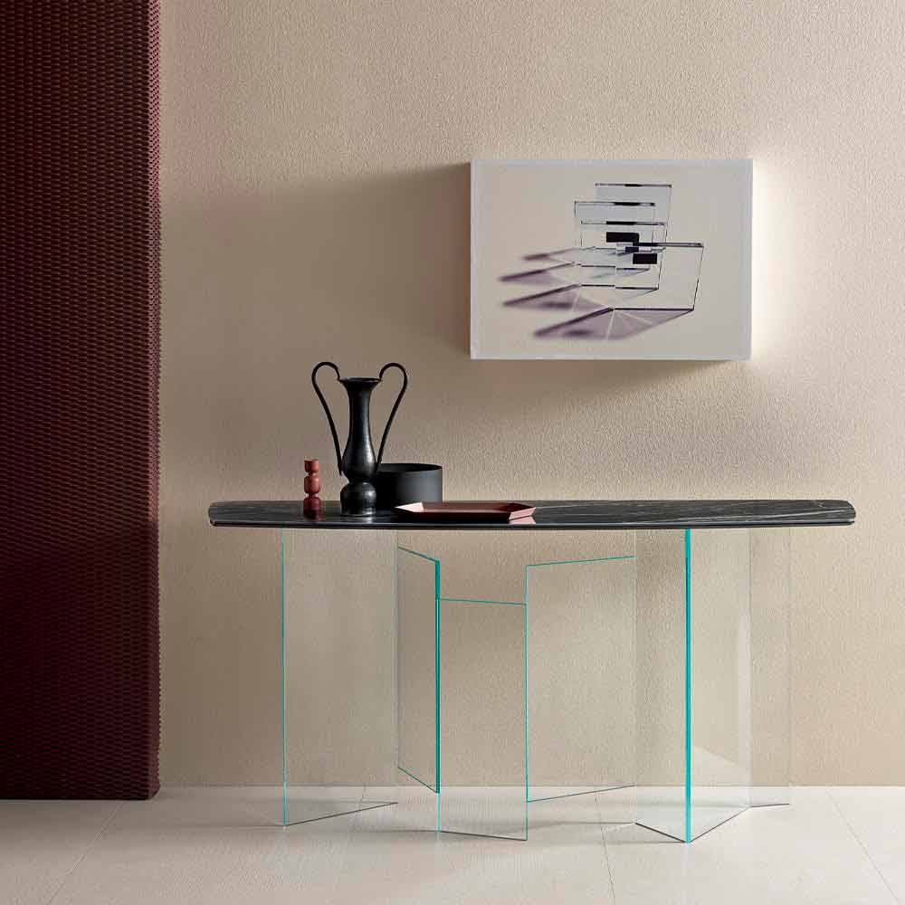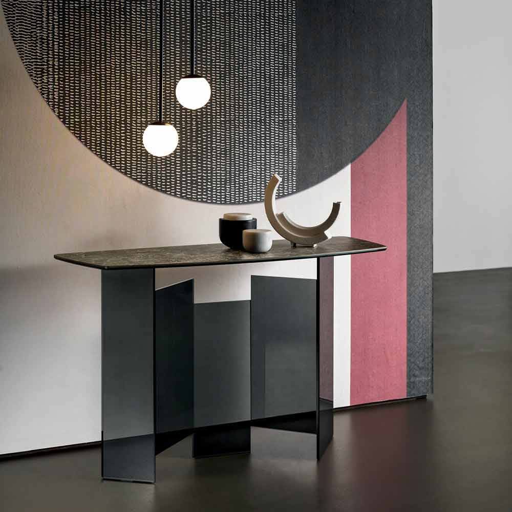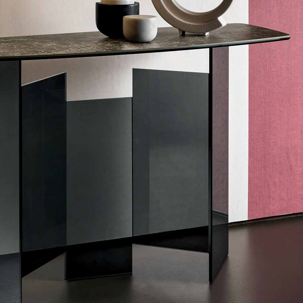 Modern vardagsrumsvagn med Emperador eller Noir Desir keramisk topp och glasbas, realiserad för hand i Italien.