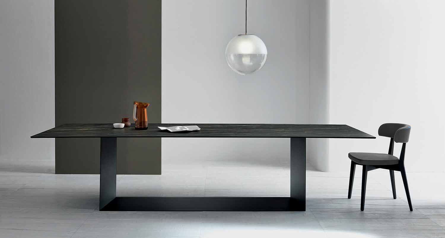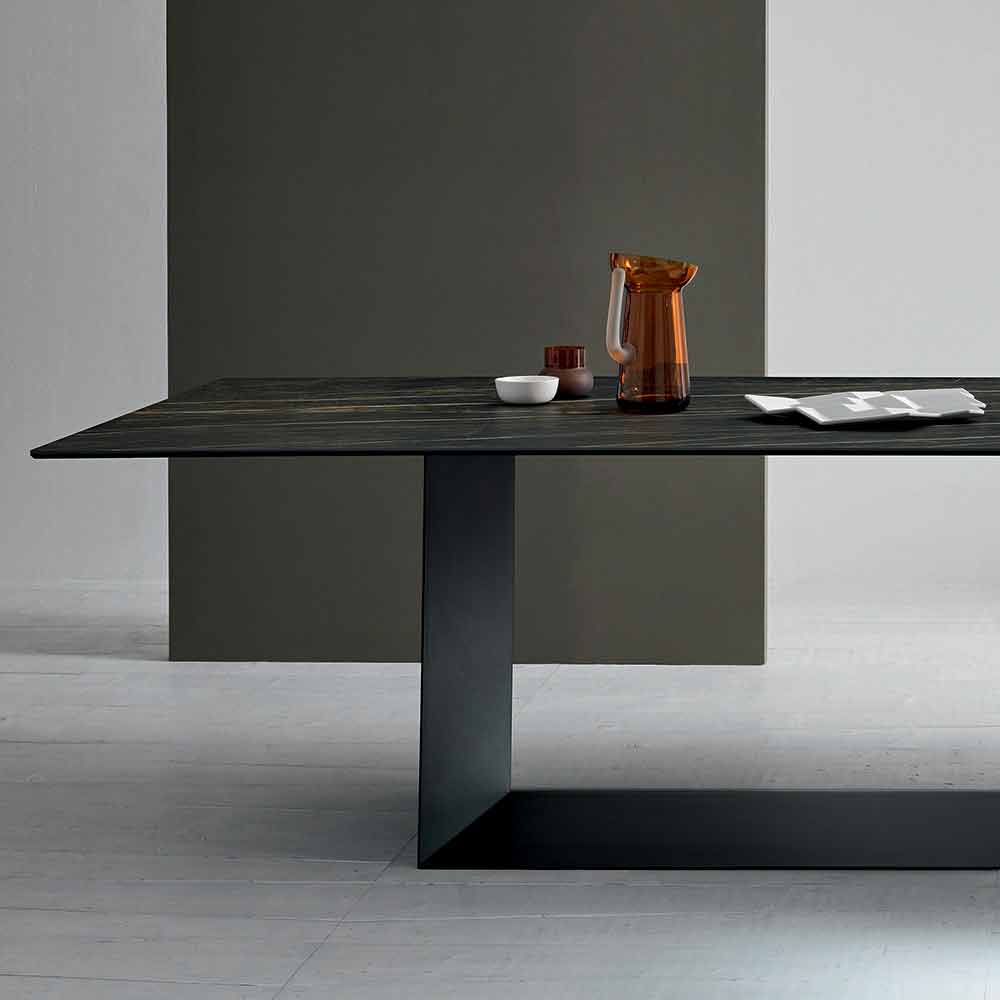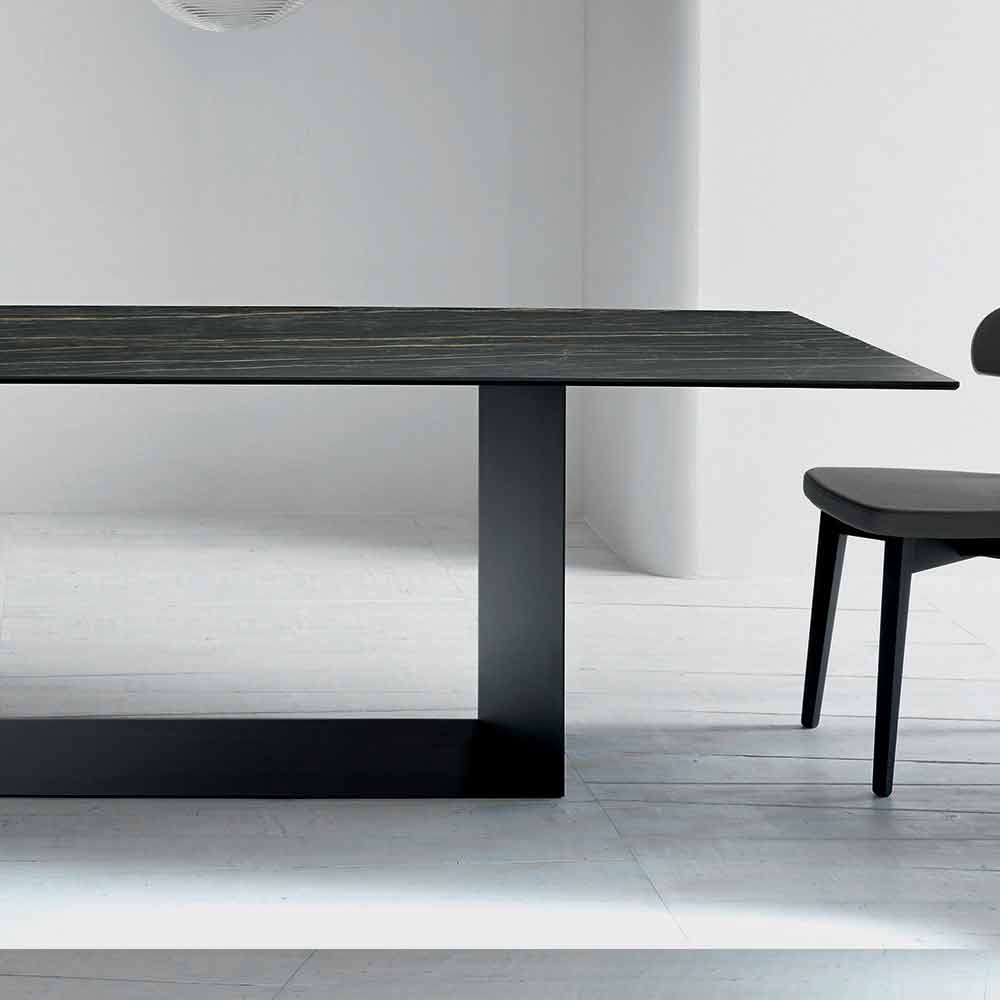Levande designbord i matt Noir Desir keramik och bas i matt grafit svart eller borstad bronsmålad metall, tillverkad i Italien.