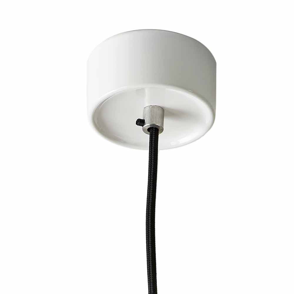 Sagan Asien fjädringslampa gjordes av keramik i vitt och grått; Klassens snabba beröring ges av sin svarta tygkabel och dess aluminiumkabelklämma.