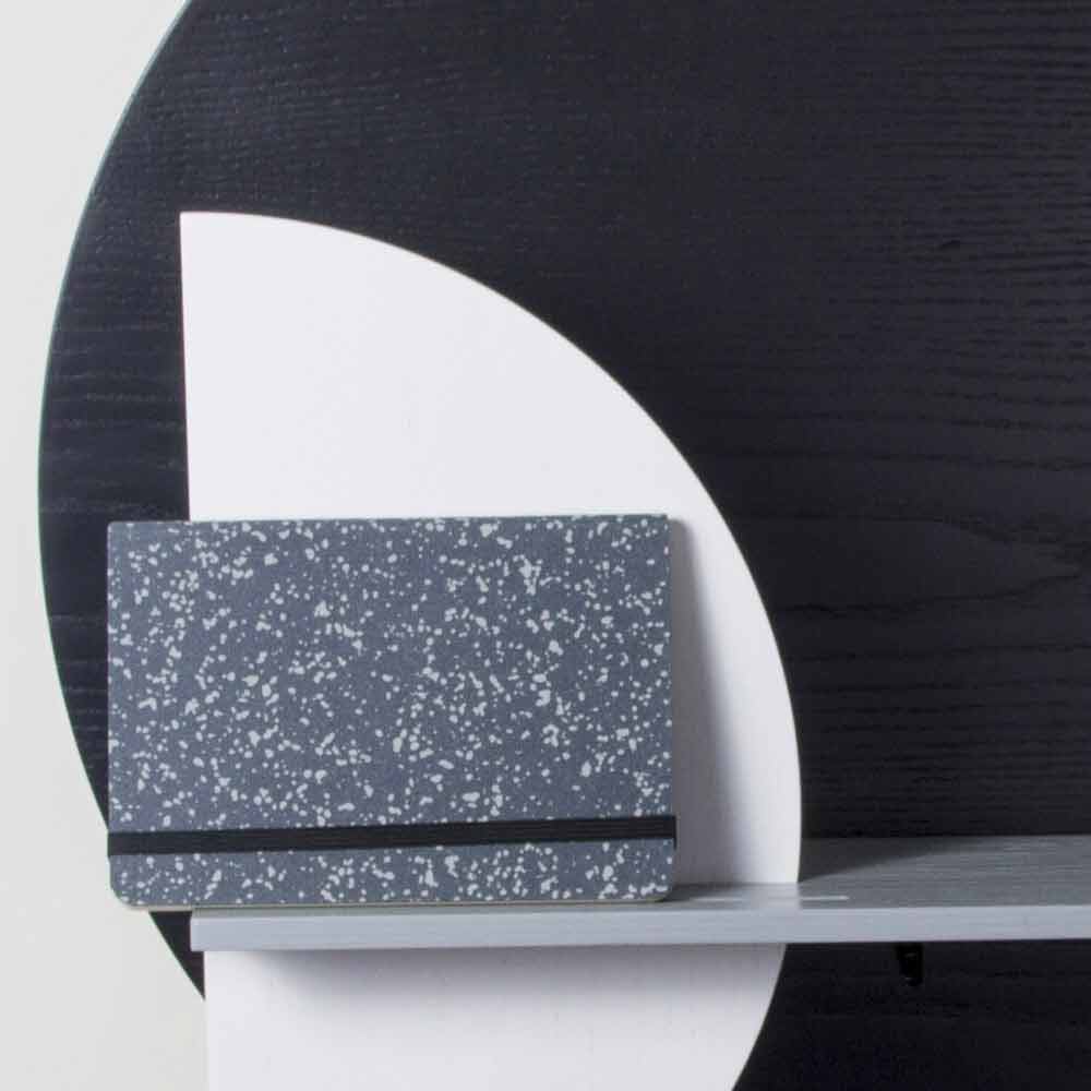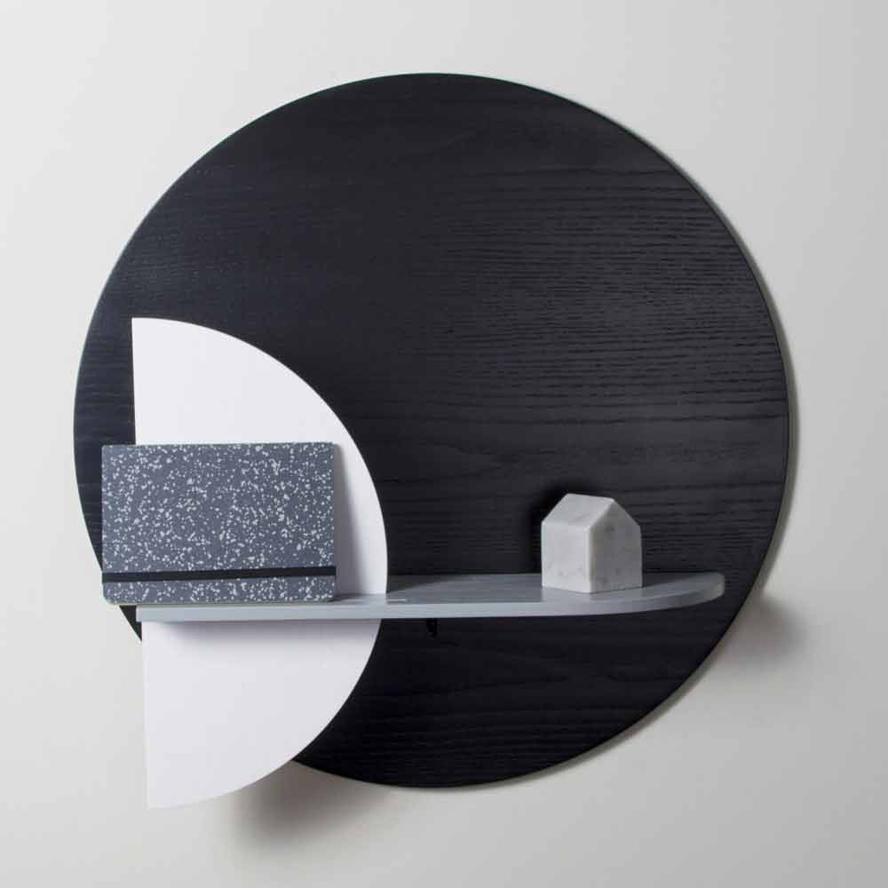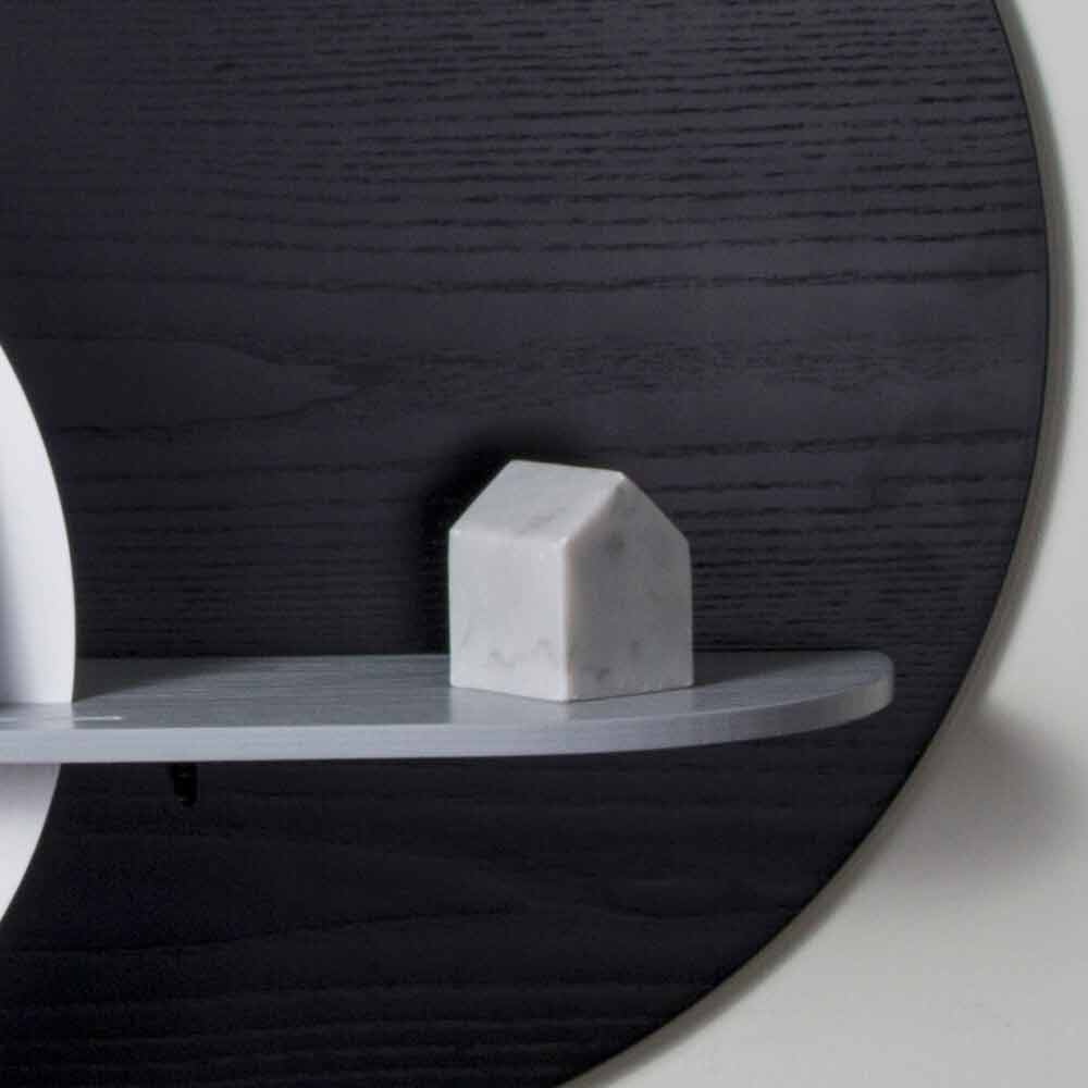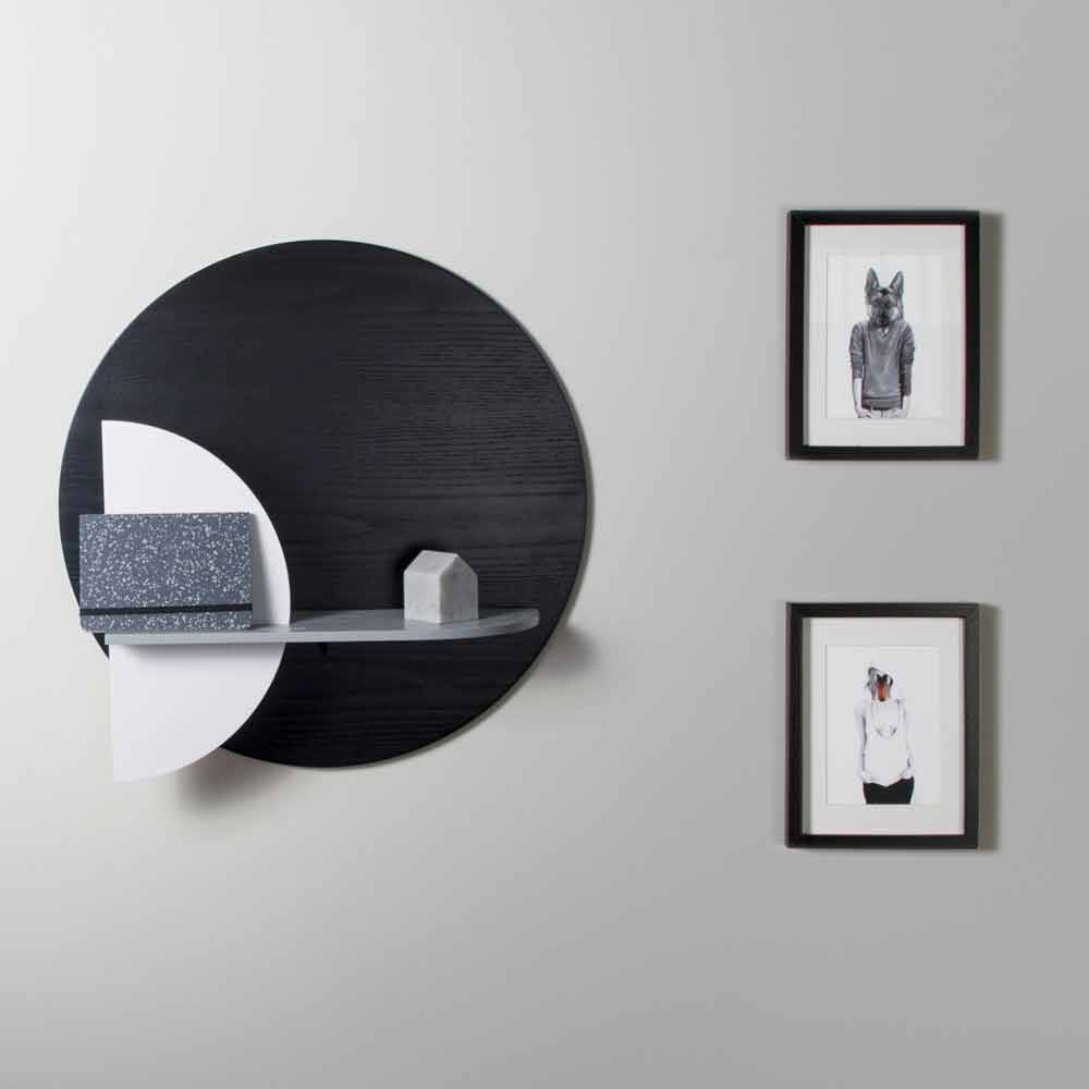 Dess struktur är sammansatt av 3 paneler av olika former tillverkade av vitt, svart och grått färgade aska plywood, av vilka en är monterad på väggen som representerar den verkliga stödytan och två vertikala paneler som ger rörelse och harmoni. Denna hyllas egenhet är möjligheten att skräddarsy produkten genom att kombinera de två vertikala panelerna som gör att du kan välja mellan 8 olika konfigurationer efter smak och behov.