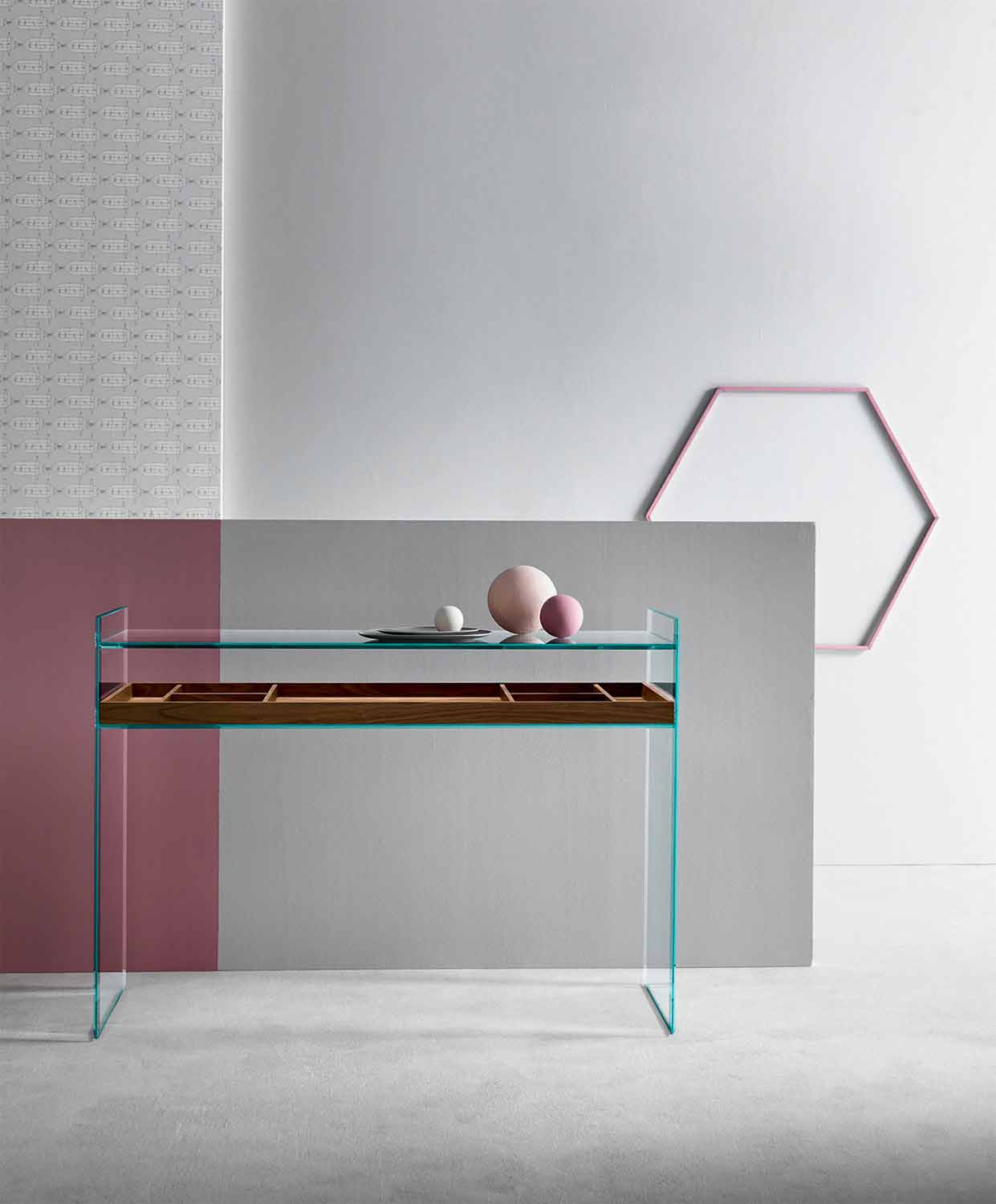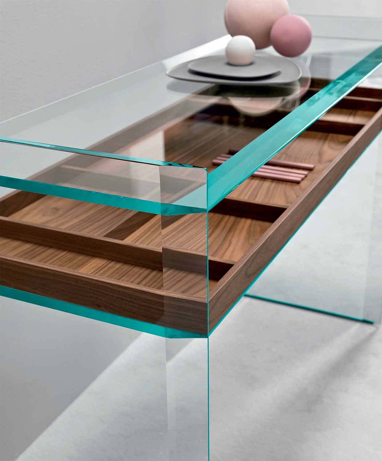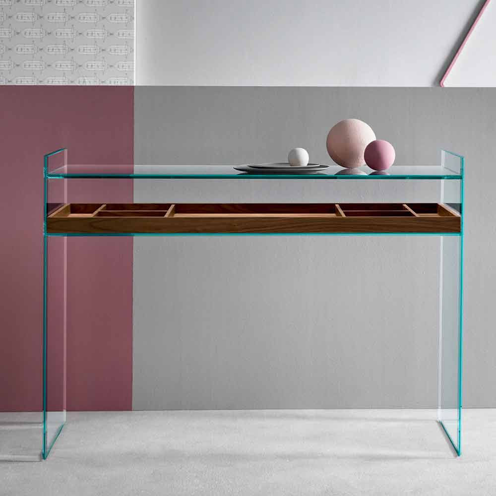 Modernt vagnsskrivbord realiserat i Italien för hand i extraclear glas med bricka i massivt trä.
