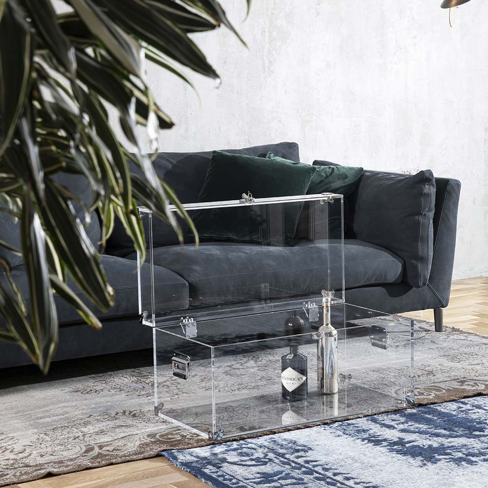Det är en möbel som vill vara en konceptuell omtolkning av den typiska vintageprodukten som dock det förvränger dess användning genom att använda ett modernt material som gör att innehållet kan visas inuti, vilket gör det till en ovanlig och fascinerande huvudperson i miljön.