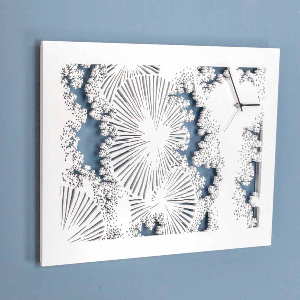 Stor väggklocka i vitt eller duvgrått trä, rektangulär och modern design, lasersniderier gjorda i Italien.