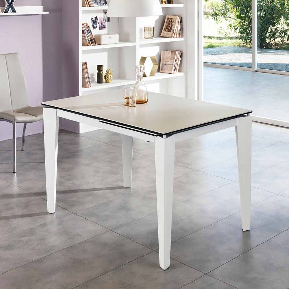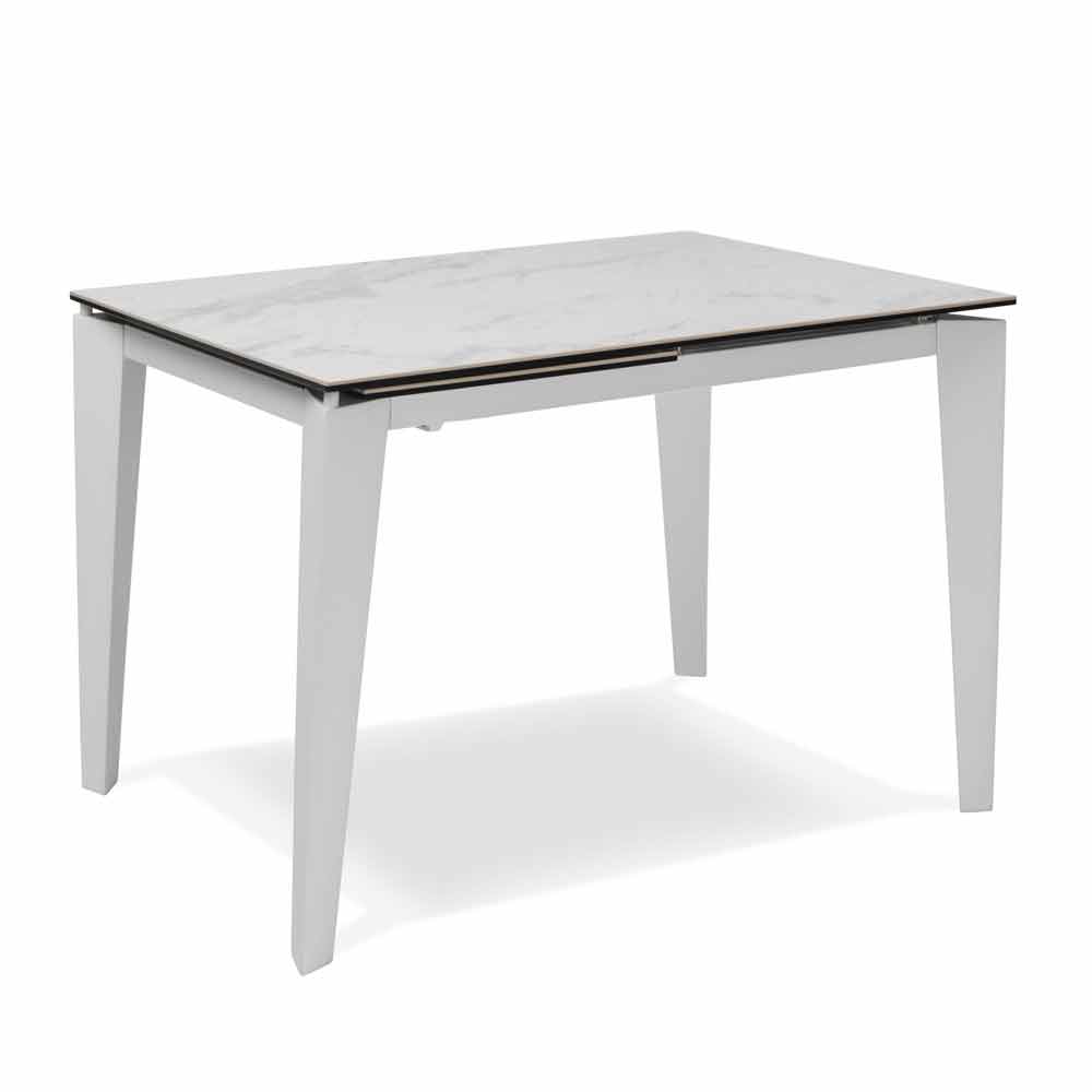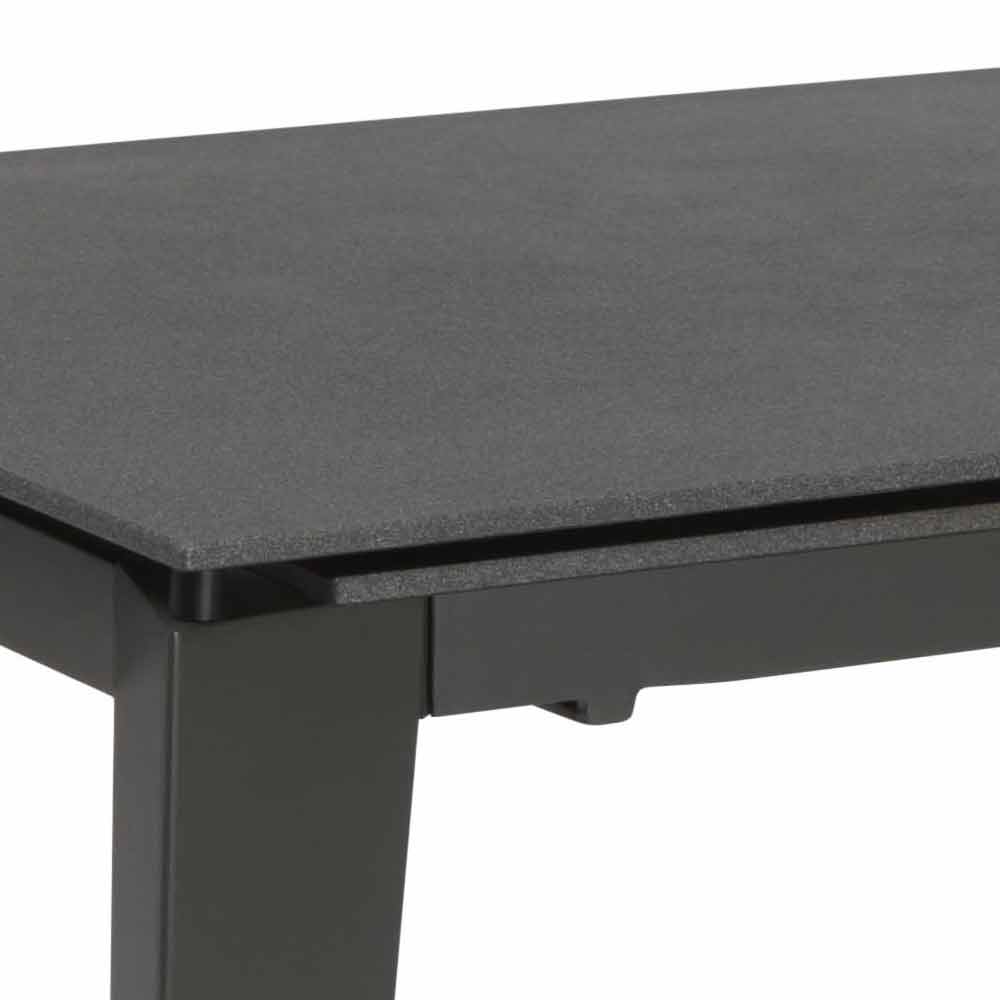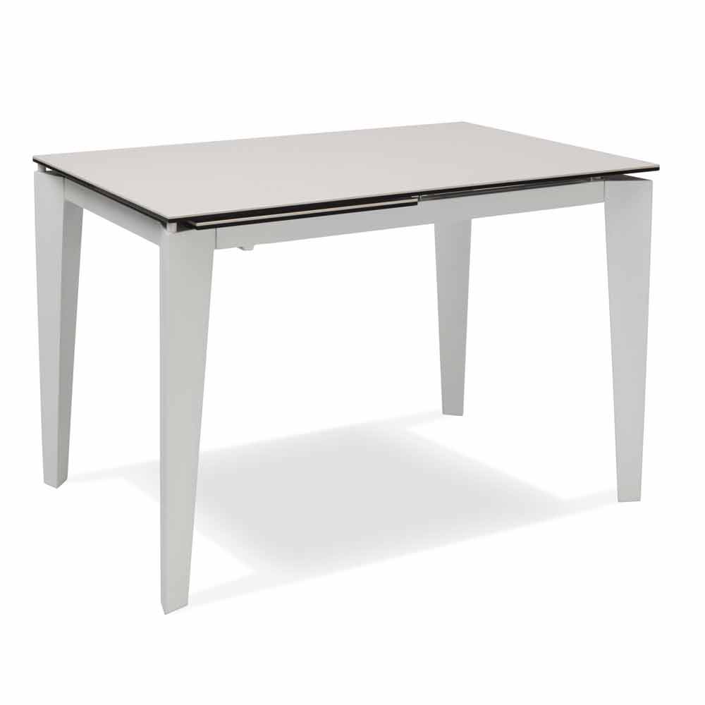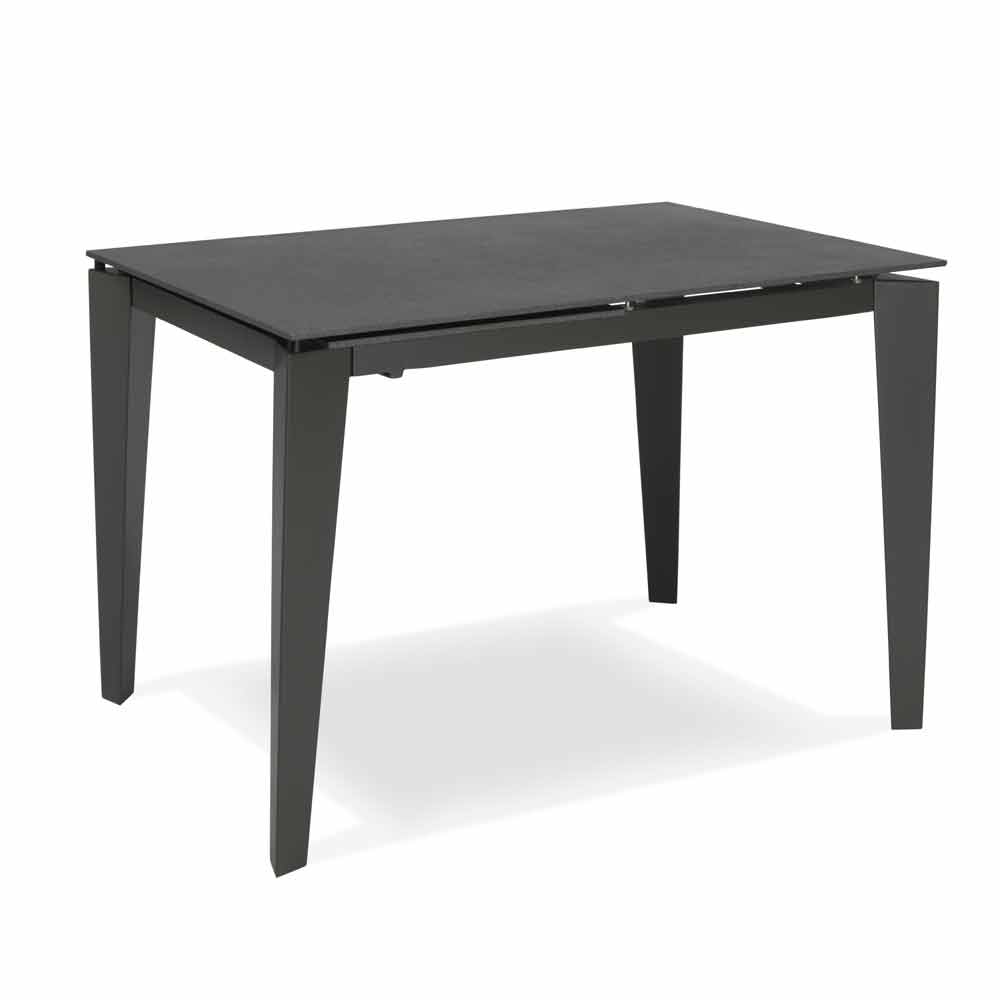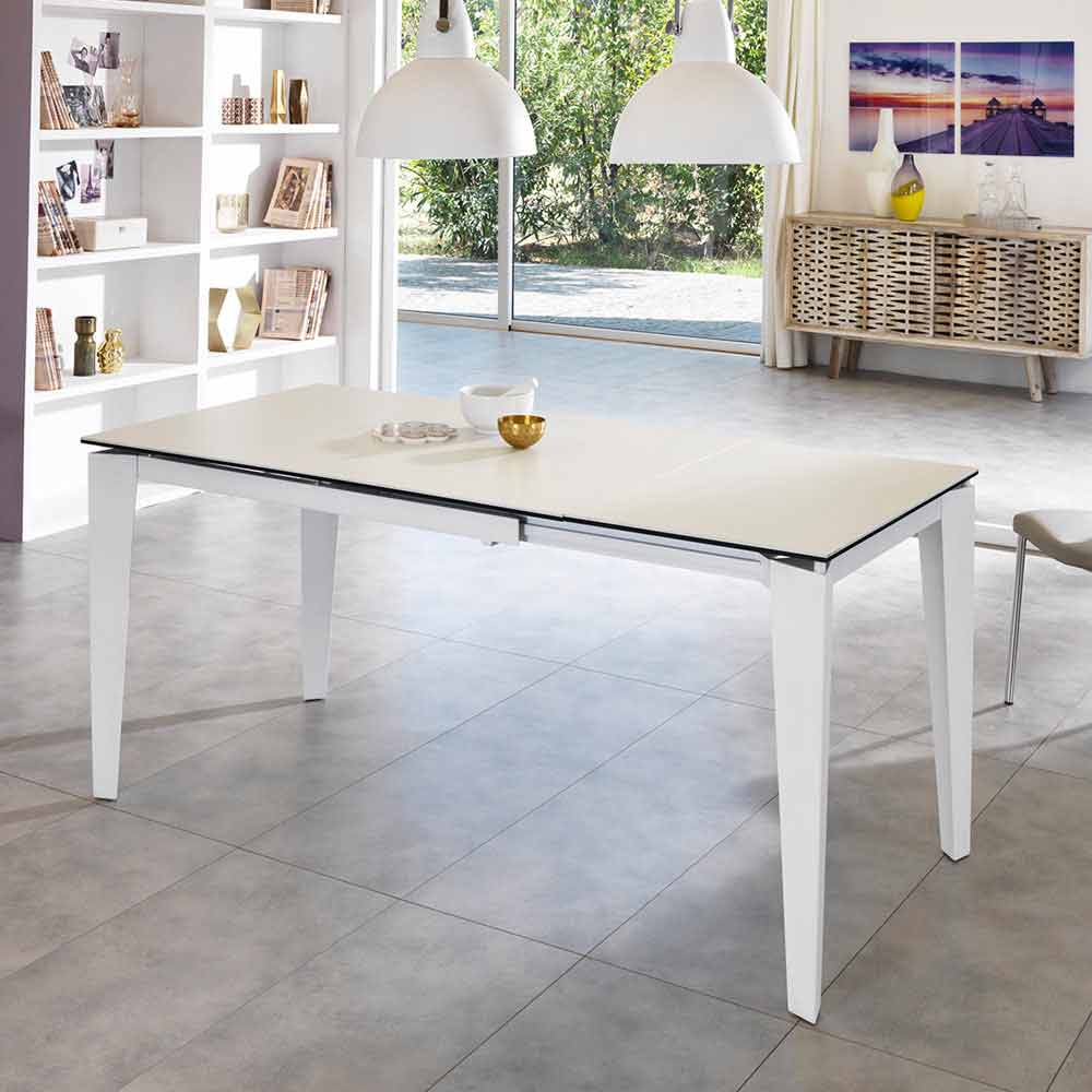 Utdragbart rektangulärt bord med mattlackerad metallbas. Topp och förlängning i glas och keramik (undre skikt i glas, övre skikt i keramik). Tack vare den praktiska förlängningen är det möjligt att förlänga bordet till en längd av 170 cm.
