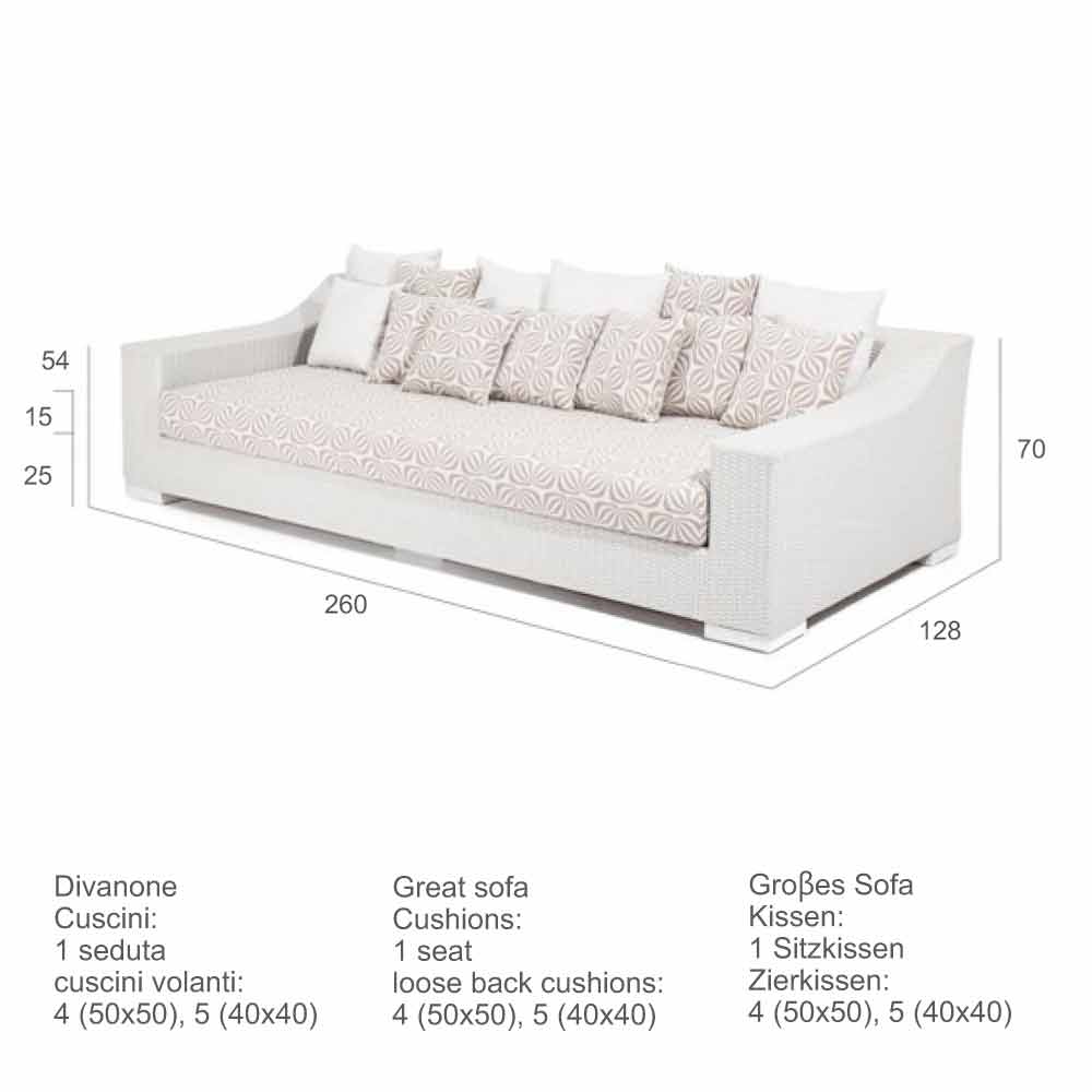 Komplett med en 'polyuretanskum stoppning. Klädseln består av en enda session, och är prydd av en myriad av lösa kuddar, omfattas alla av ett Tempotest tyg, vattenresistent och UV-strålar och finns i olika kromatiska variationer, solid färg.