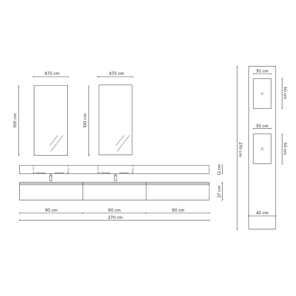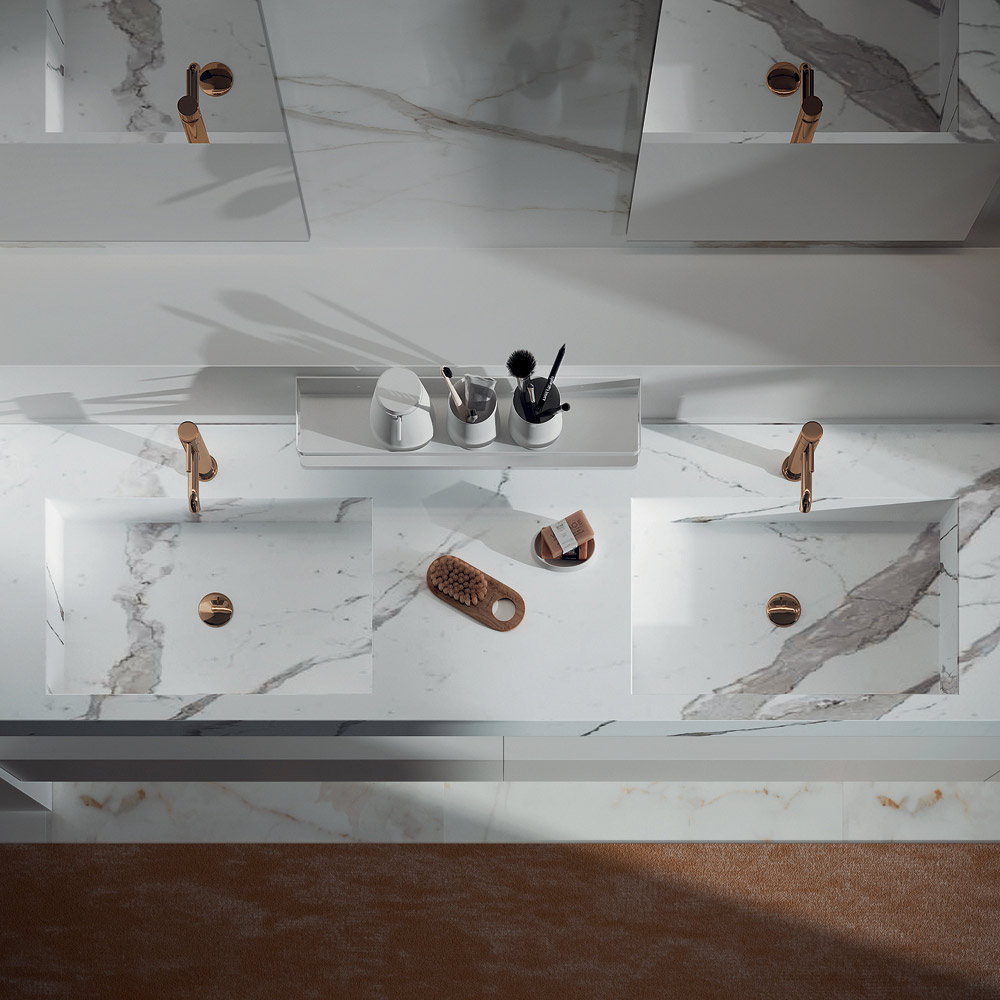 Dubbel badrumskomposition med dubbel rektangulär glasspegel , blank vit reptålig melaminbotten med tre lådor med mjukstängning och HPL boxtop med integrerad dubbel calacattafärgad handfat .