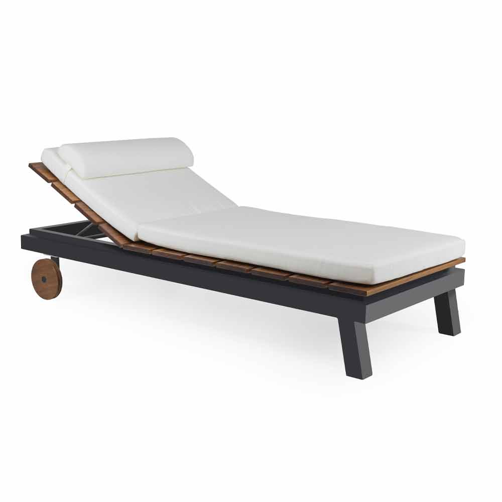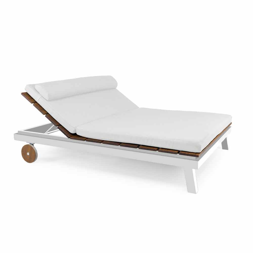 Enkel eller dubbel designträdgårdsstol i vitt eller svart aluminium, träribbor och hjul och kuddar.