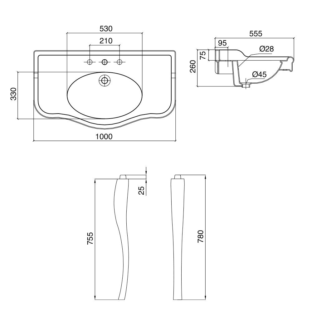 - Skiva: B 100 x D 55,5 x H 26 cm med enkelt handfat; ben: H 78 cm med stänkskydd och stänkskyddskant 1-3 kranhål - L 1000 mm;