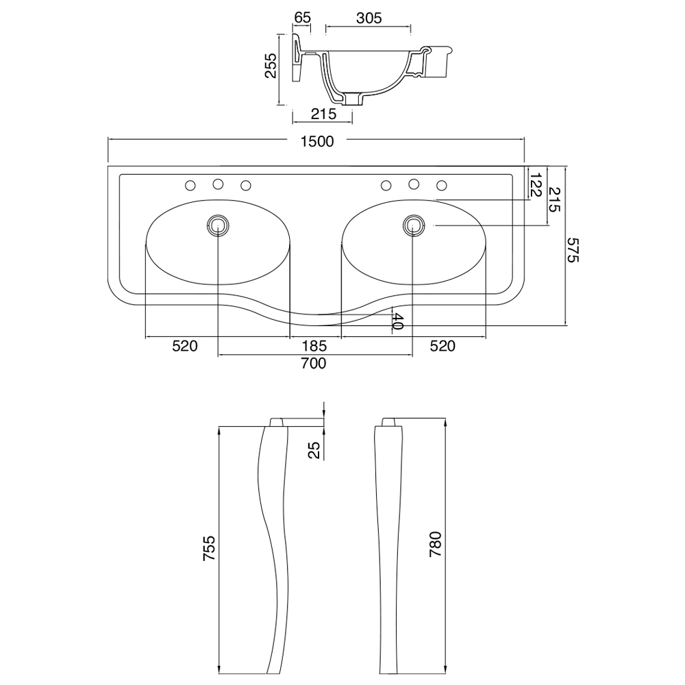 - skiva: B 150 x D 57,5 x H 25,5 cm med dubbla handfat; ben: H 78 cm med stänkskydd 1-3 kranhål för handfat - L 1500 mm;