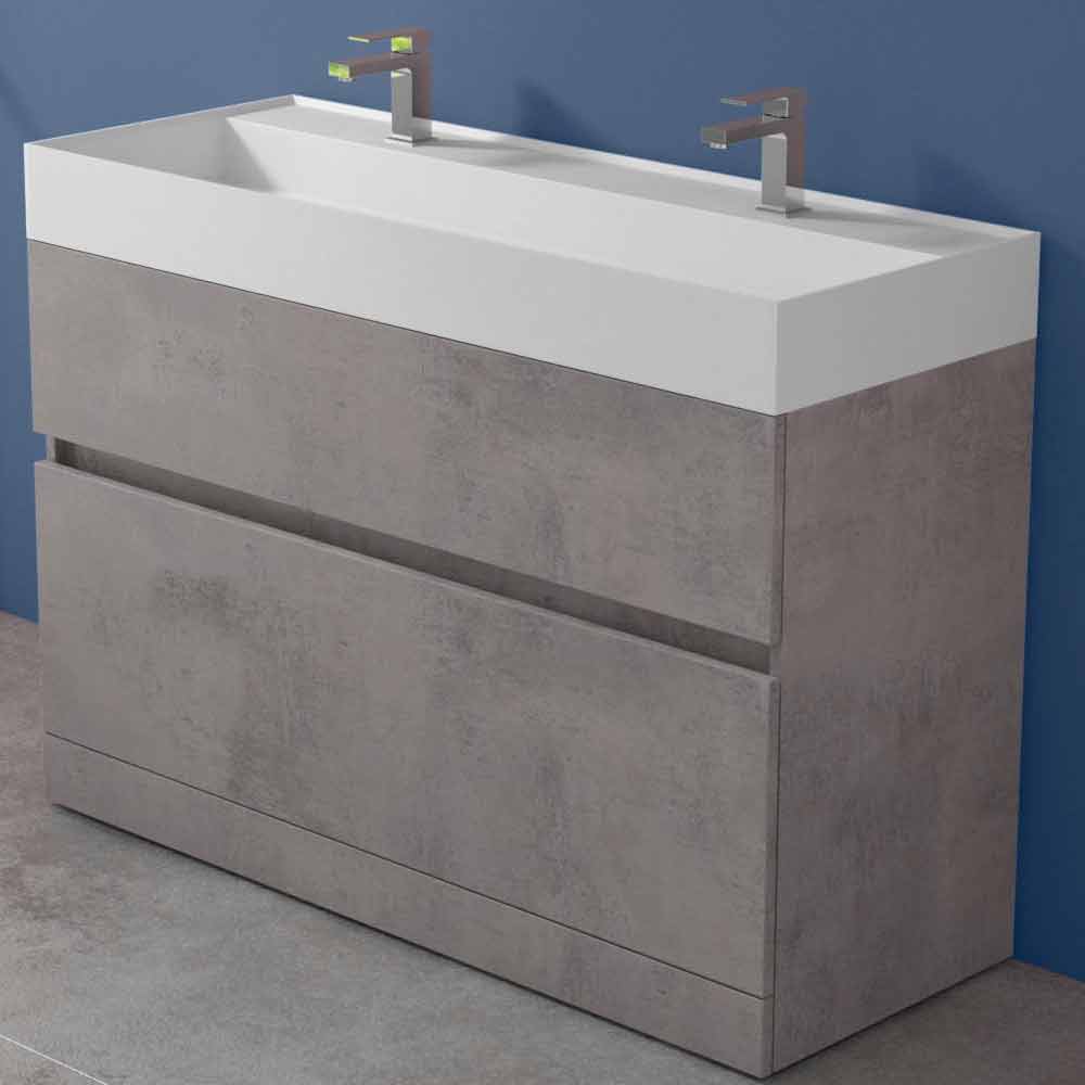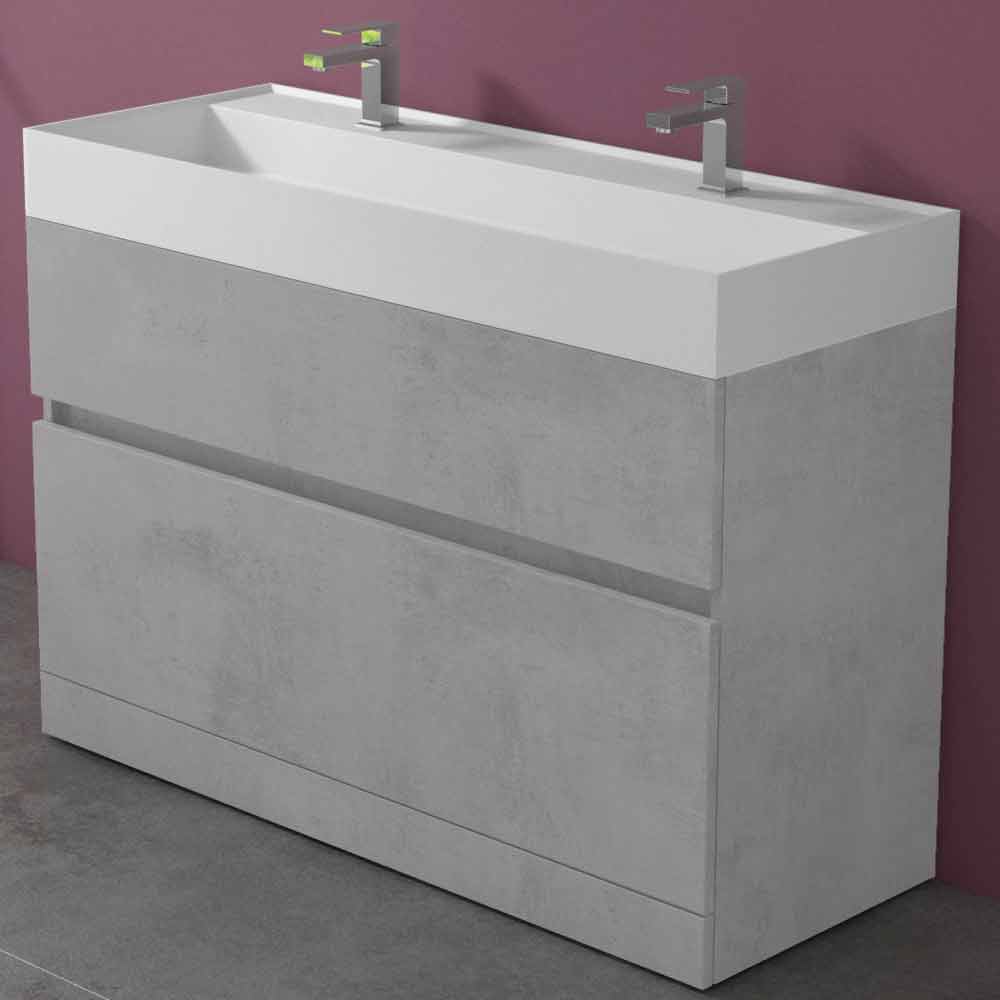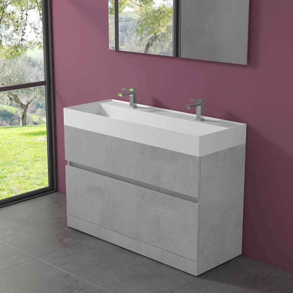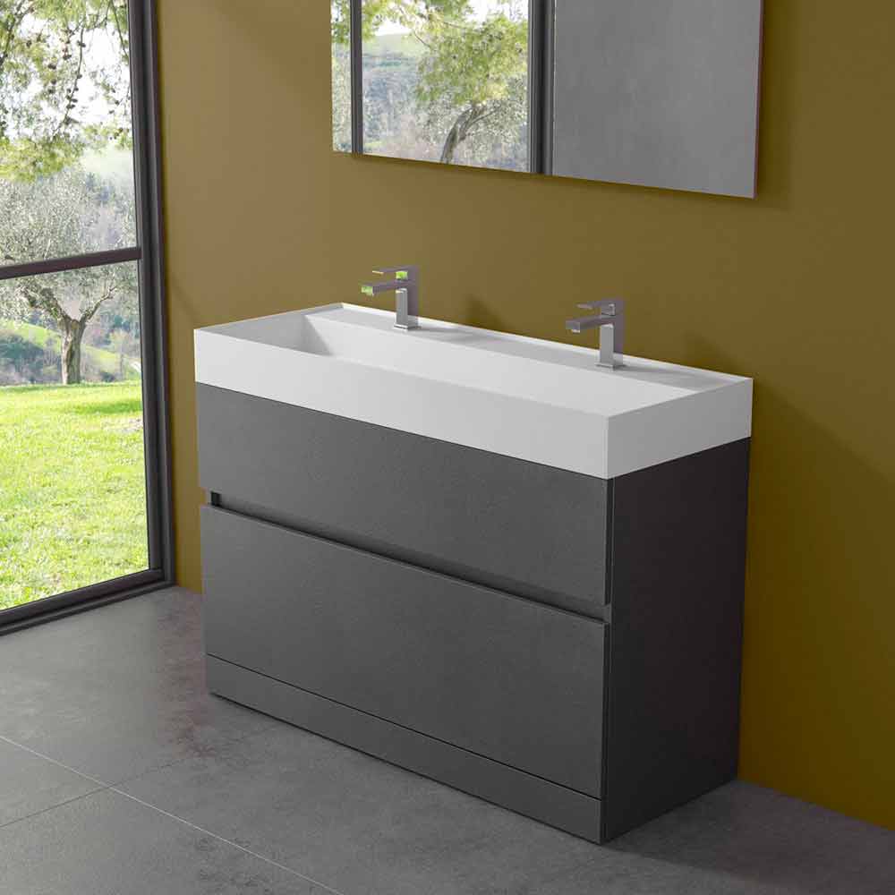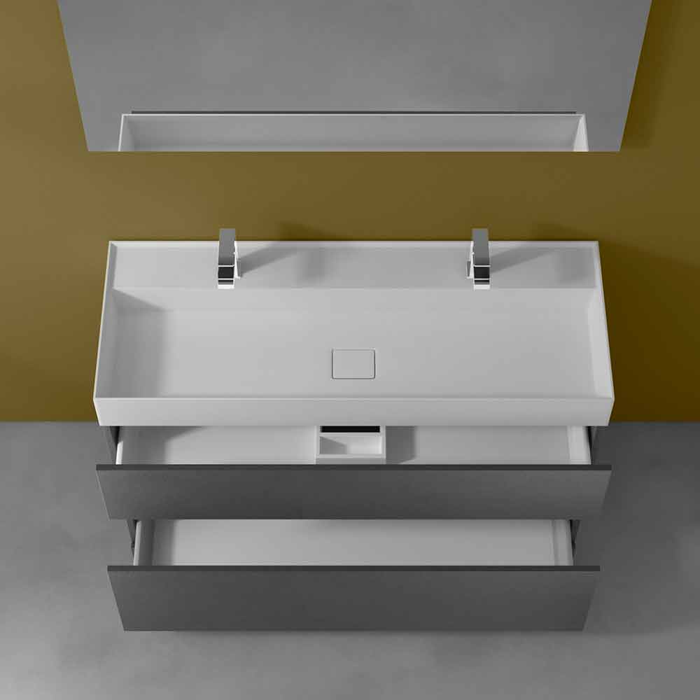 Badrumsskåp med dubbla handfat, modern design i laminat med olika ytor med korg och låda, tillverkad i Italien.