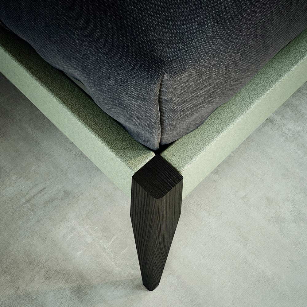 visuell balans mellan sängens stora volym, berikad av den speciella centrala sömmen och sängramens sobera och väsentliga linjer. Elementen som omger det kombineras med det, vilket skapar en