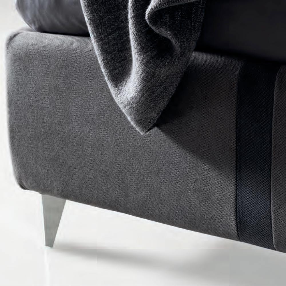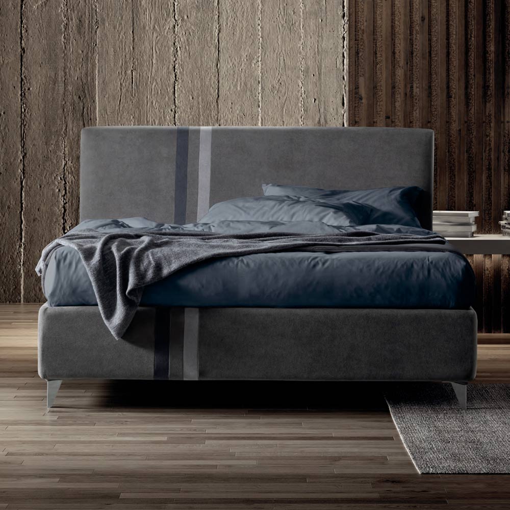förvaringsbox, metallfötter med polerad stålfinish (höjd 12 cm) och sänggavel som kännetecknas av finishen med två tvåfärgade vertikala och parallella ränder på sänggaveln och sängramen i vattenavvisande och fläckbeständigt tyg .