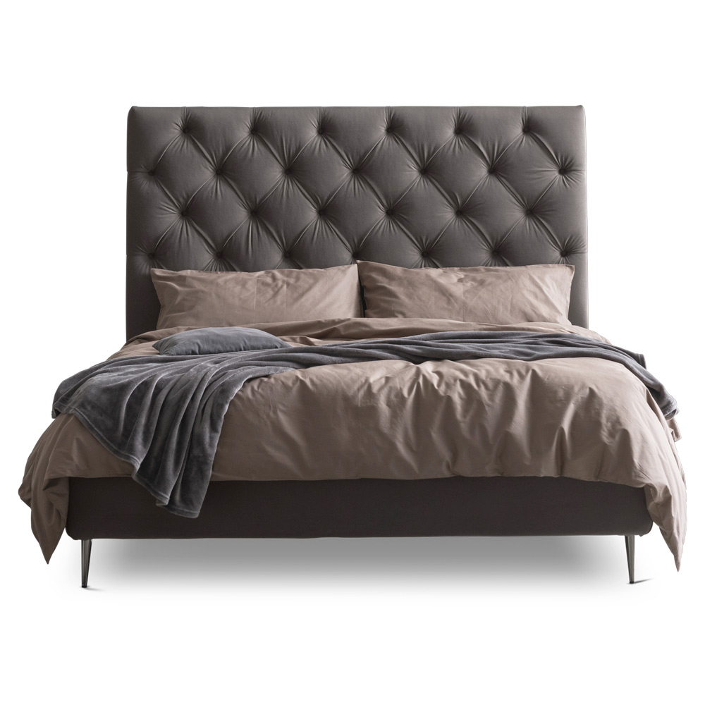 förvaringsbox, metallfötter i mockafinish (höjd 15 cm) och kännetecknas av ett värdefullt quiltat utförande i den brandsäkra sänggaveln i tyg och dess avsevärda höjd som gör den unik och elegant.