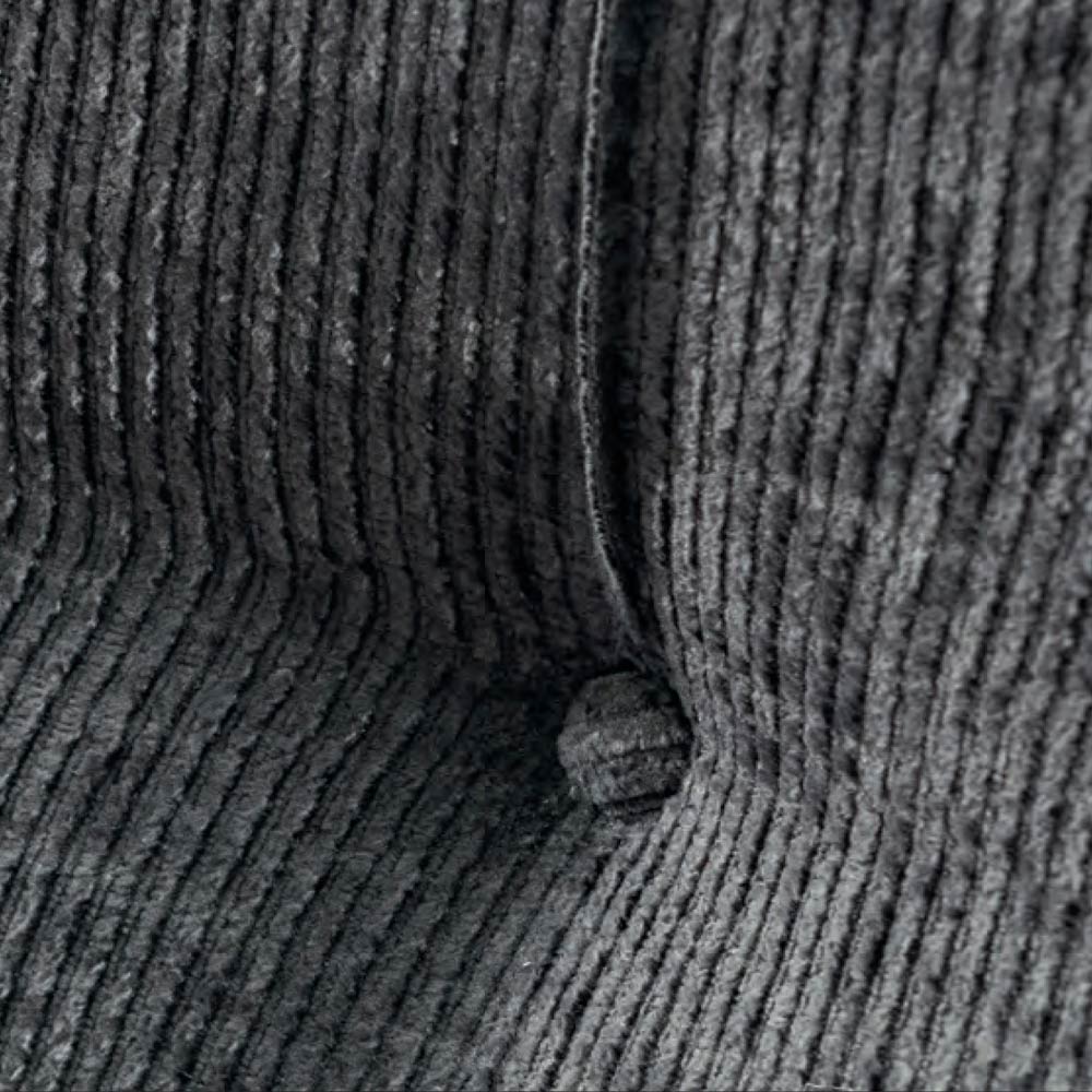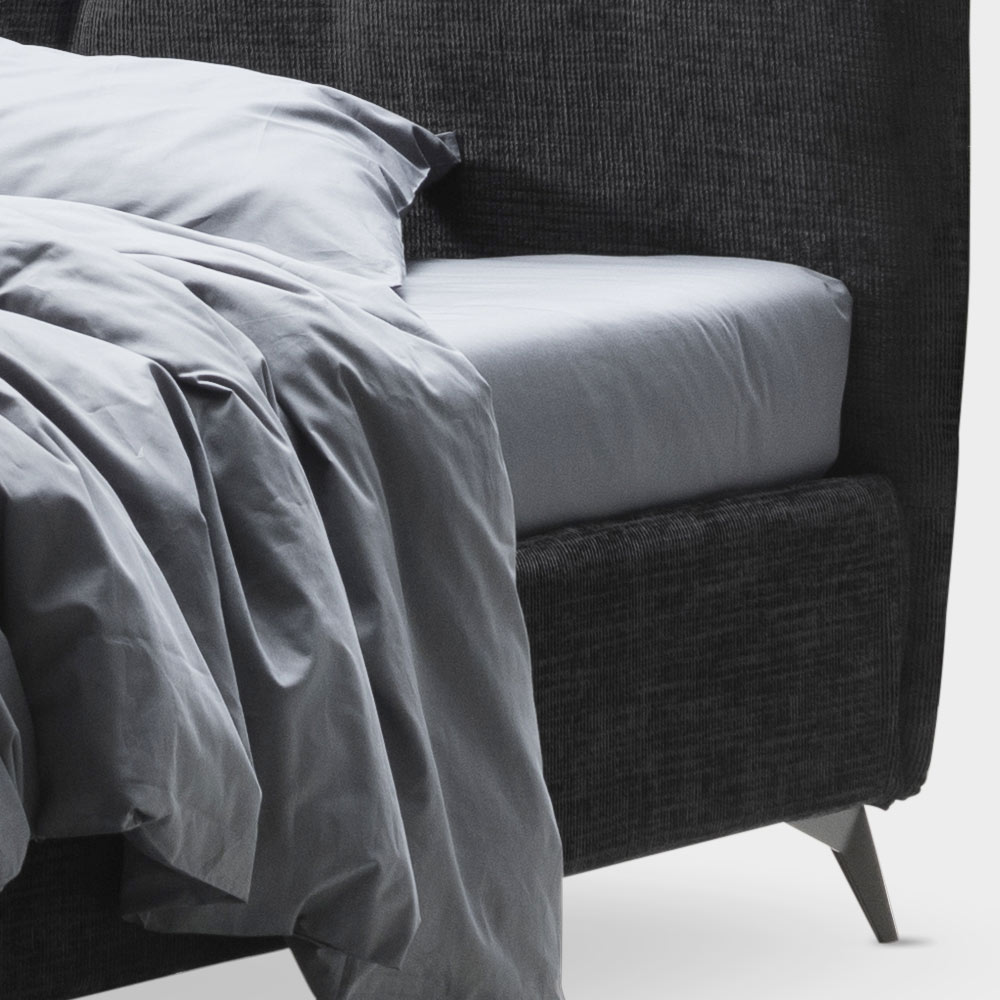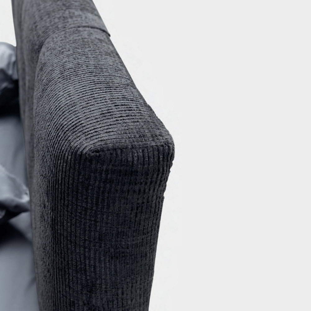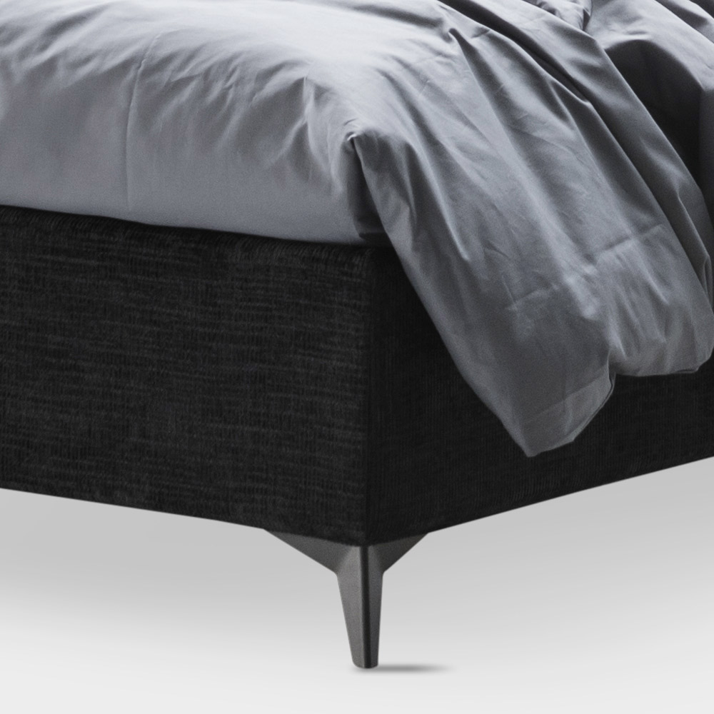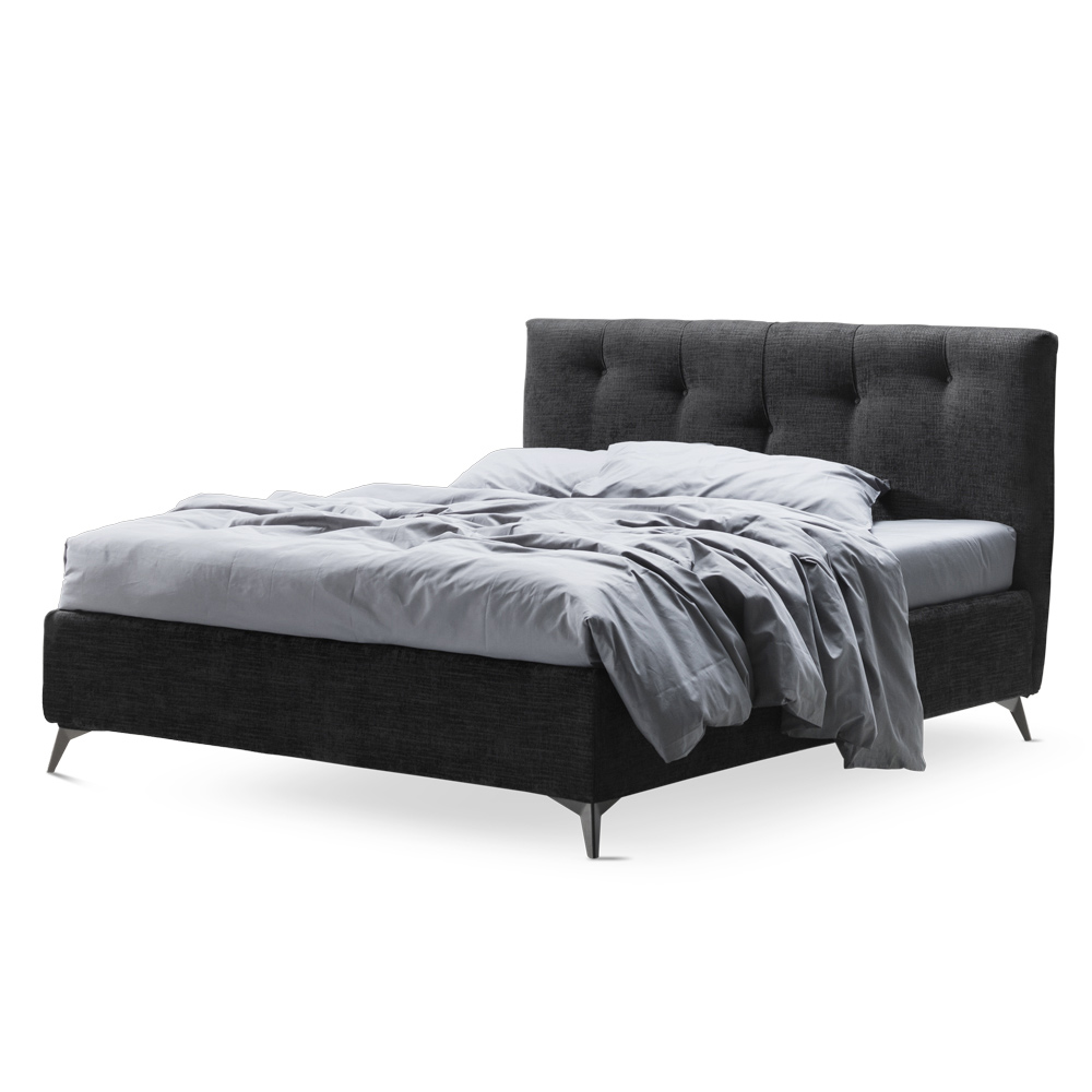 antracitfinish metallfötter (höjd 13,5 cm) och sänggavel som kännetecknas av präglade vertikala snören prydda med knäppt quiltning.