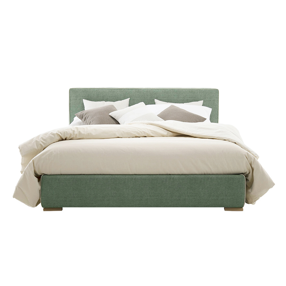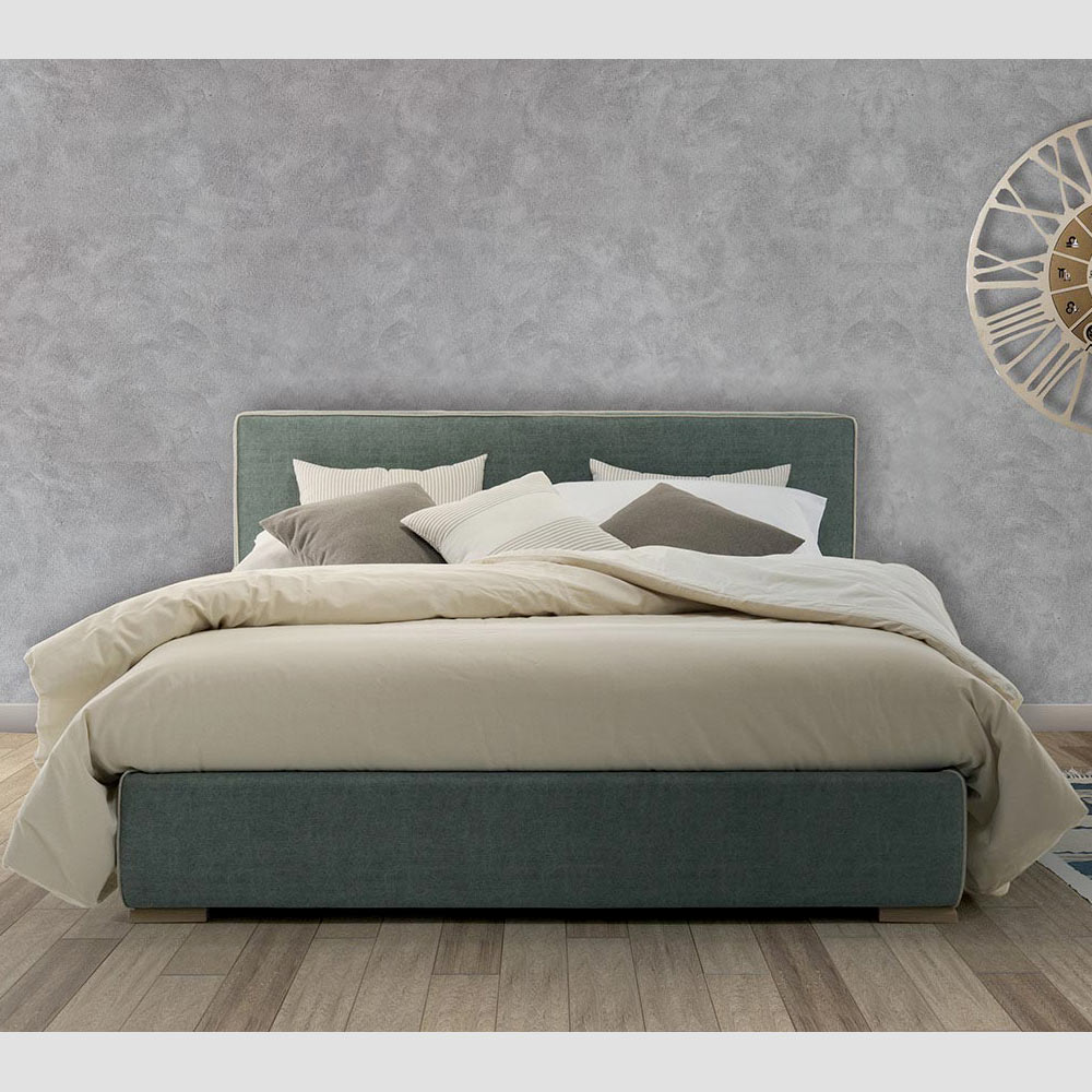 Lyxig dubbelsäng med förvaringslåda, handgjord i Italien i eko-läder eller tyg.