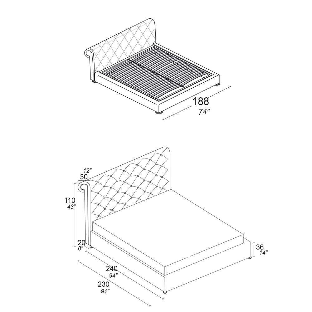 - längd: 188 cm x djup: 240 cm x höjd: 110 cm - lämplig för en madrass på 160x200 cm