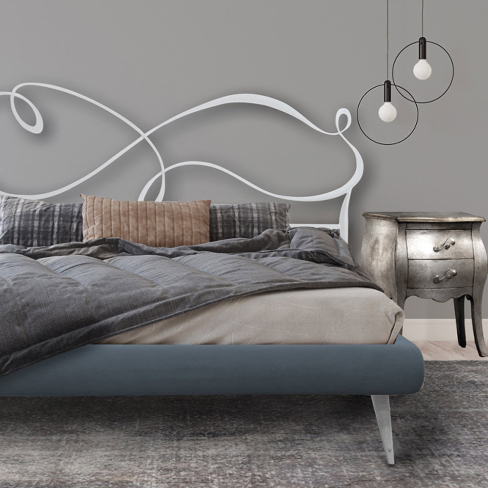 Sängfinish:- satinvit sänggavel, sängstomme i grå/blå sammet och vita träfötter