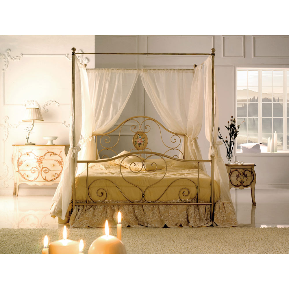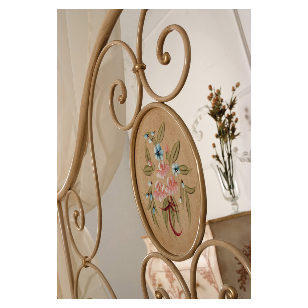 antik elfenbenspulverlackerad finish . Denna säng är ett val av karaktär med en avgjort klassisk smak som innehåller oöverträffad mjukhet och förfining. Den blommiga detaljen på sänggaveln är handgjord med stor omsorg och uppmärksamhet för att ge produkten den där unika och oupprepbara touchen.