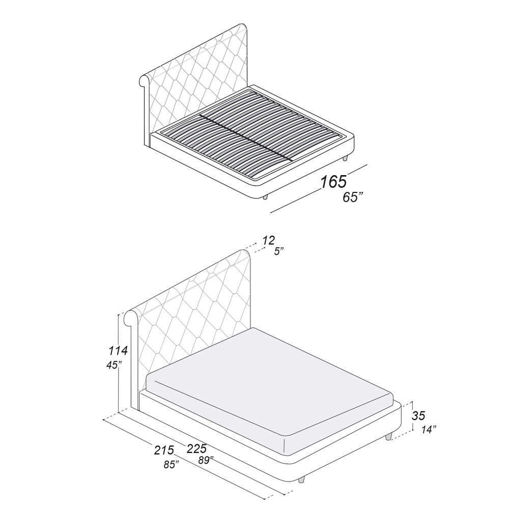 - längd: 165 cm x djup: 225 cm x höjd: 114 cm - lämplig för en madrass på 140x200 cm