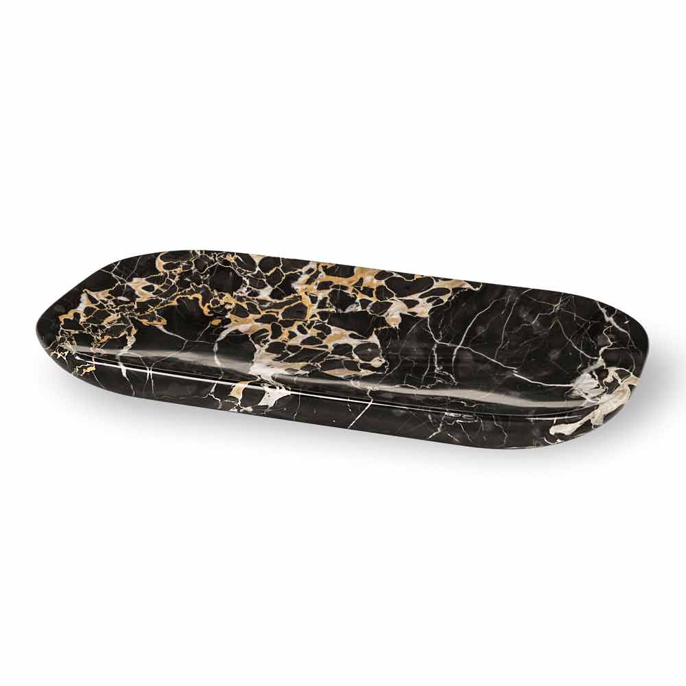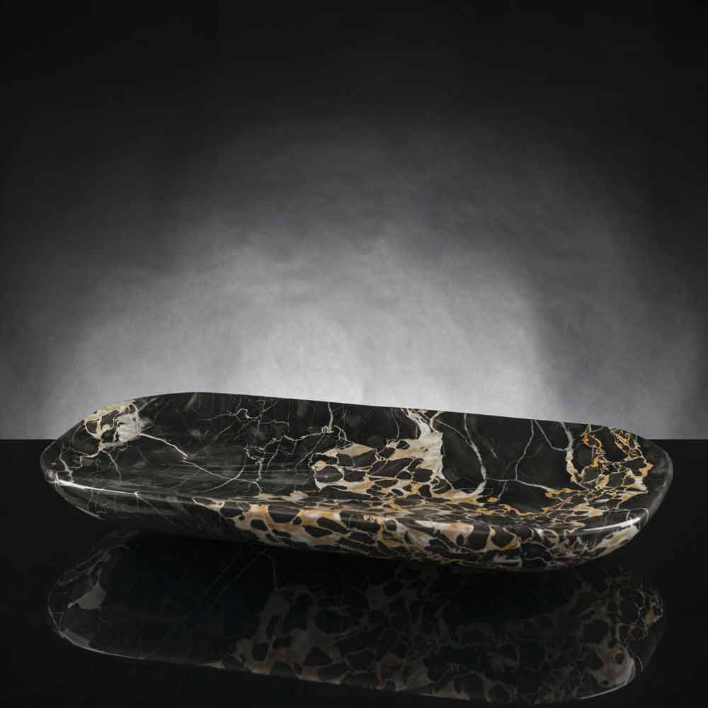 Dekorativ bricka helt tillverkad i Italien i Portoro-marmor , ett material som genom bearbetning av natursten möjliggör mer komplexa former. Ett föremål för inneboende elegans som uppstår från mötet mellan studiet av naturfenomen och interaktionen mellan olika material och de tekniker som används av människan. Resultatet är ett sofistikerat inredningstillbehör som kan berika alla matbord eller områden i huset så att det kan användas som en riktig bricka men också som en ficktömare eller som ett enkelt dekorativt element som kan ge möblerna en extra touch tack vare marmornas tidlösa elegans och dess underbara vener.