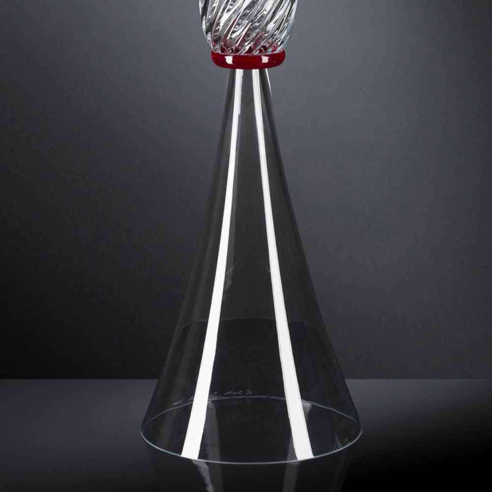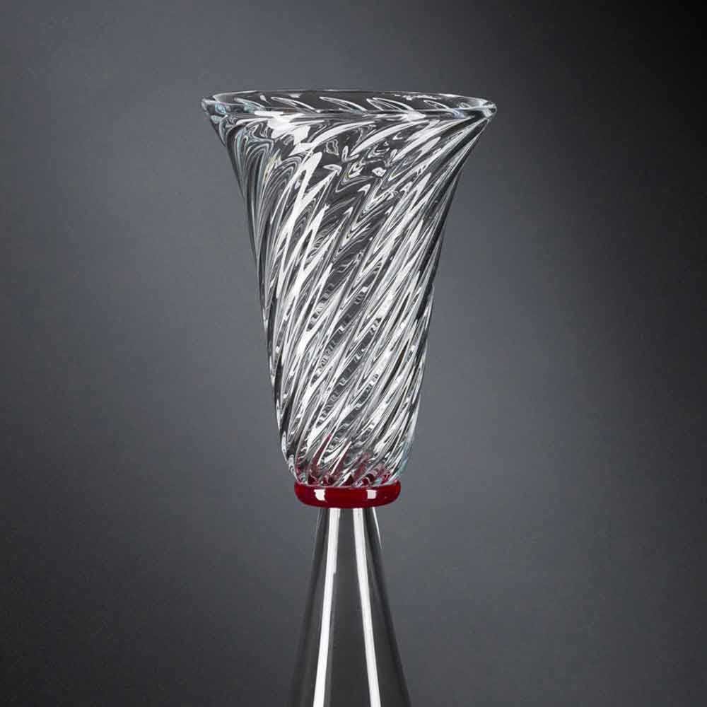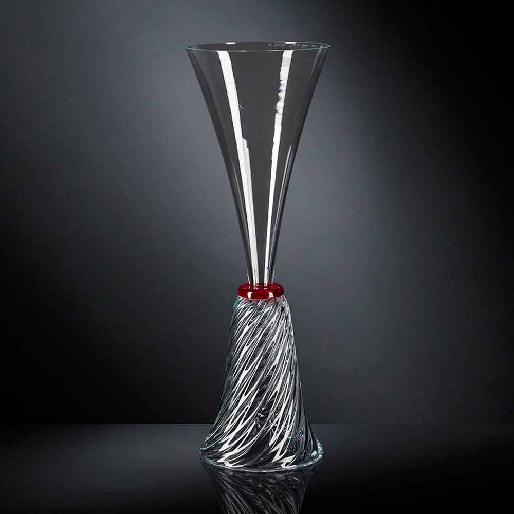 Elegant inomhusvas gjord av transparent Murano-blåst glas med röd detalj genom en process helt tillverkad i Italien . En unik och raffinerad design som påminner om ett timglas som återges i en modern nyckel för att ge liv åt en idé om exklusiva och avantgardistiska möbler. Dess estetik visar sig vara särskilt mångsidig tack vare de neutrala ytbehandlingarna som används och som samtidigt betonar dess värde och höga kvalitet tillsammans med det underbara utförandet som kännetecknar vasens övre del. En idealisk stil för de mest varierade miljöerna, från heminredning till hotell, restauranger, kontraktsområden, spa men också som en miljö för evenemang och bröllop.