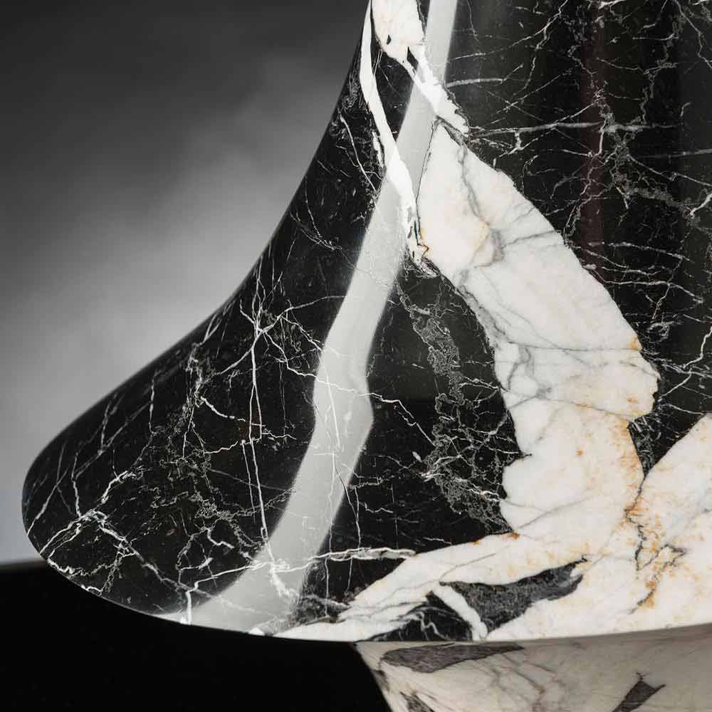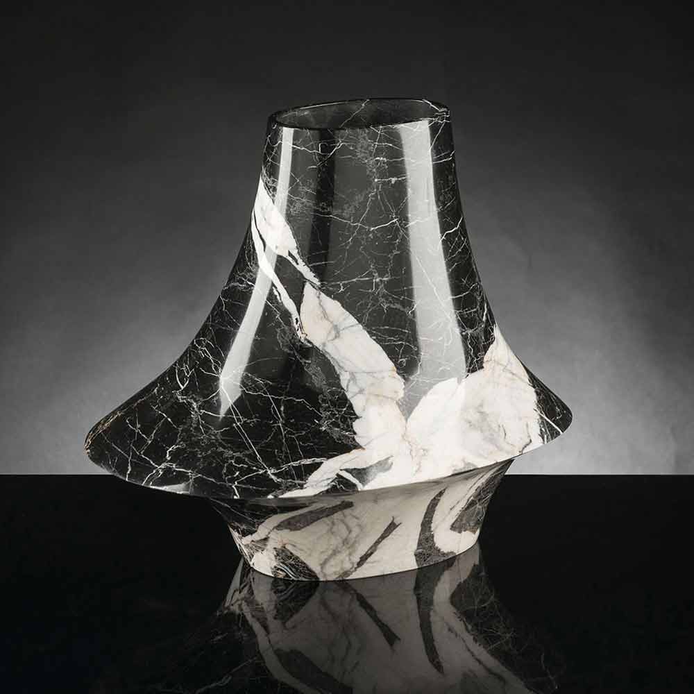 Inomhus dekorativ vas gjord av svart marmor med vita vener genom en 100% tillverkad i Italien produktion . Produktionen sker genom bearbetning av naturstenar med 5-axliga strömavtagare som gör det möjligt att få mer komplexa former än enkla rotationsvolymer. Denna eleganta möbel kommer från sambandet mellan studiet av naturfenomen och interaktionen mellan de material som används med mänsklig teknik för att ge liv till en unik och avantgardistisk möbelstil. Resultatet är ett exklusivt dekorativt element som kan berika alla miljöer med en modern och raffinerad estetik med personlighet. En idealisk stil för de mest varierade miljöerna, från heminredning till hotell, restauranger, kontraktsområden, spa men också som en miljö för evenemang och bröllop.
