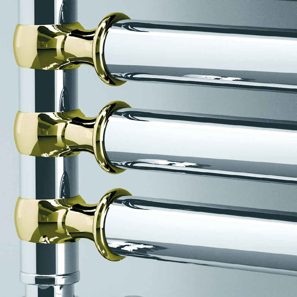 Denna sofistikerade stålradiator är definitionen av elegans och funktionalitet. Den slimmade designen och flera horisontella linjer optimerar inte bara värmespridningen utan erbjuder också en praktisk lösning som handdukshållare . Kombinationen av polerat stål med gulddetaljer ger en touch av värme och lyx, vilket gör den till ett perfekt komplement till moderna eller klassiska badrum.