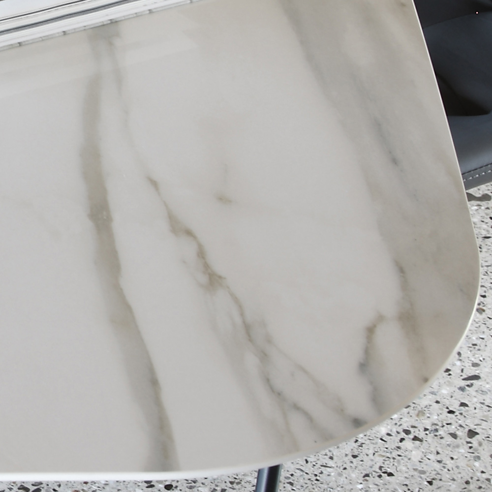 Elliptiskt matbord med målad stålstruktur och blank keramikskiva.