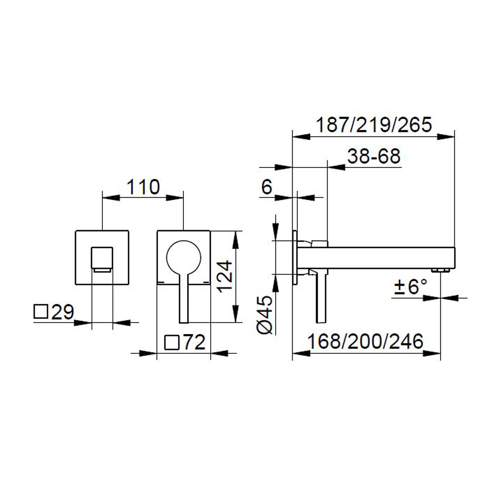 Väggmonterad ettgrepps blandare för tvättställ, fyrkantig design, 3 storlekar.