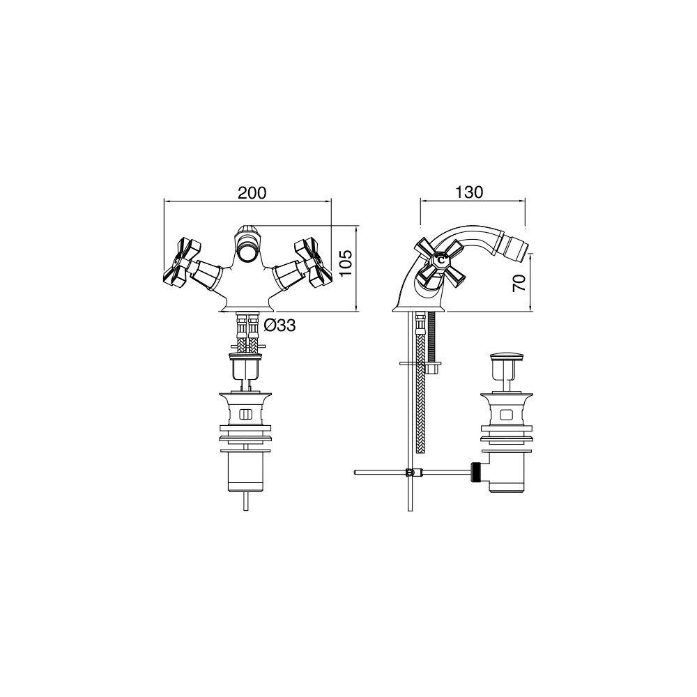 blandare för en-håls bidé med avlopp, tillverkad i mässing.