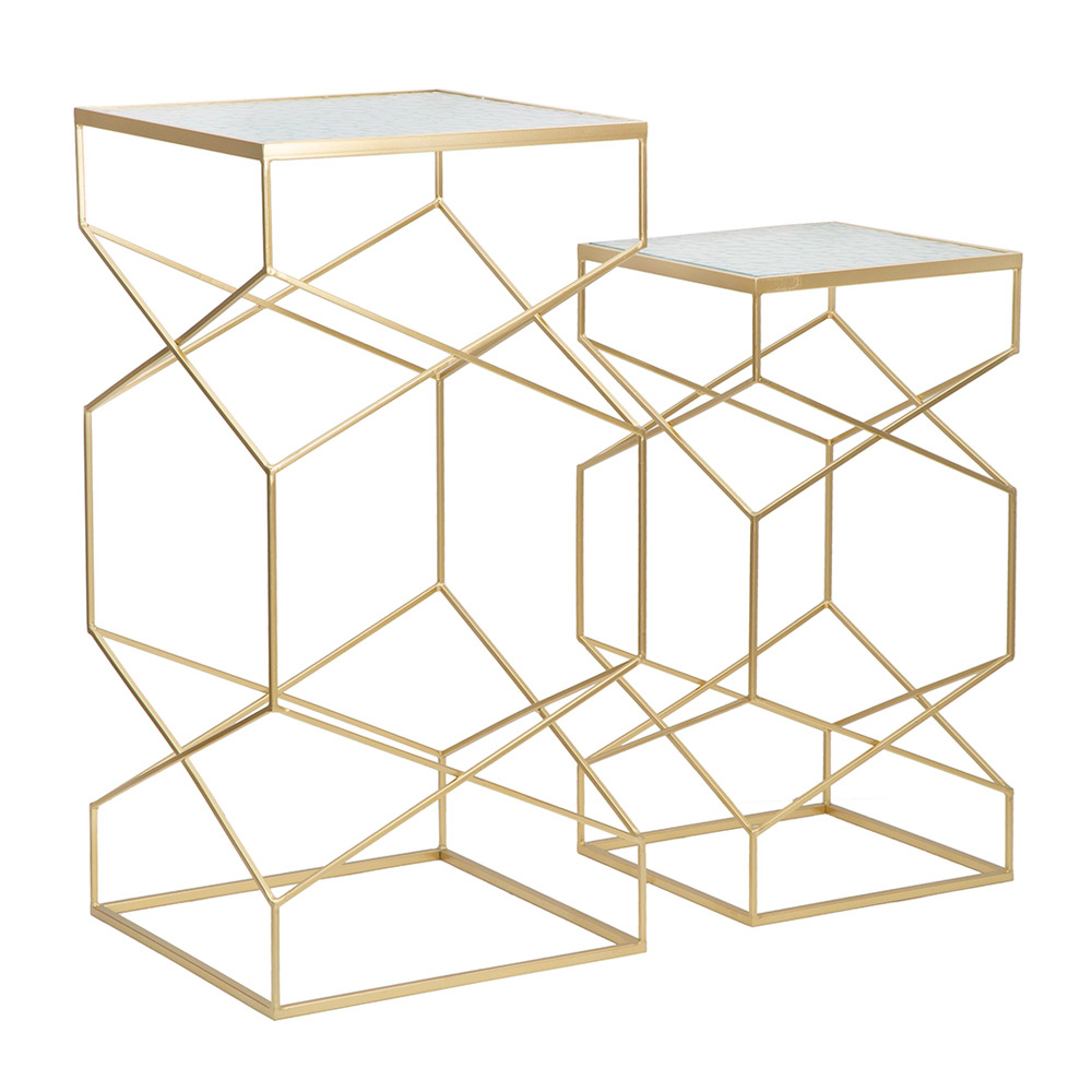 Dessa soffbord är äkta designjuveler, som kombinerar konstnärlig finess med strukturell soliditet . Deras gyllene metallbas bildar ett gitter av geometriska linjer som flätas samman i en visuell balett av former och volymer, vilket skapar en tredimensionell effekt som nästan är skulptural.