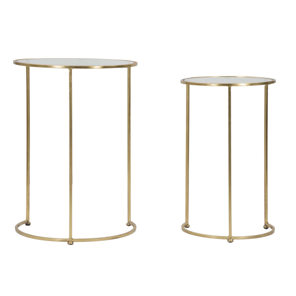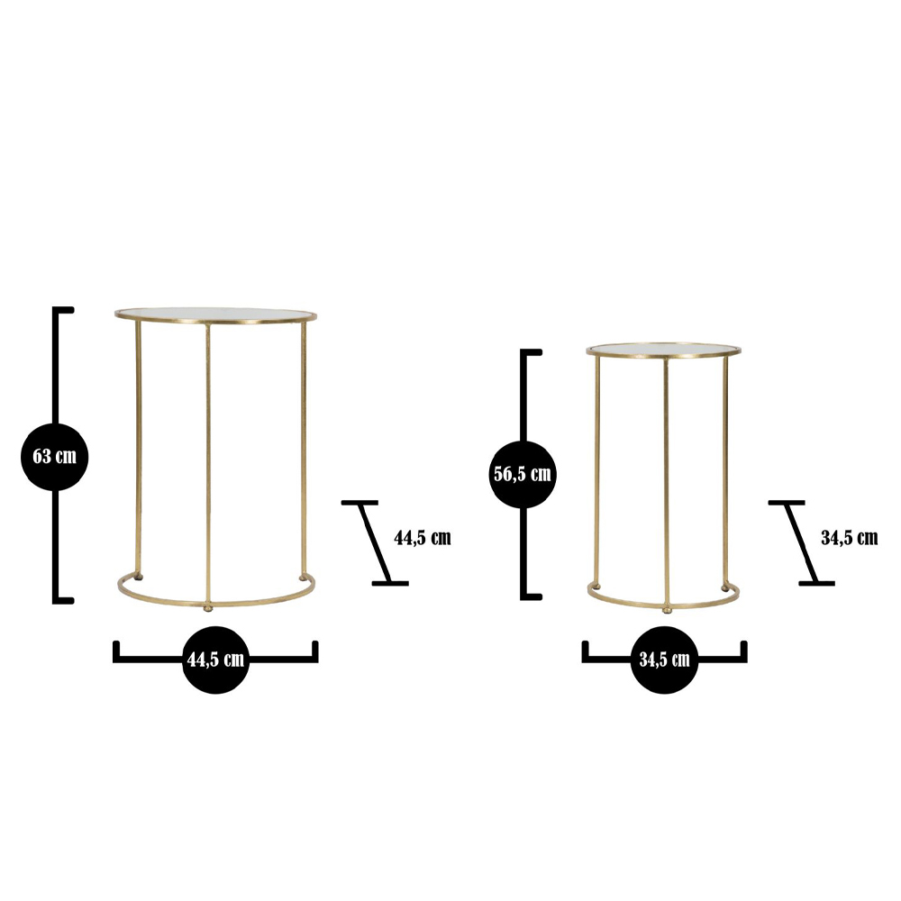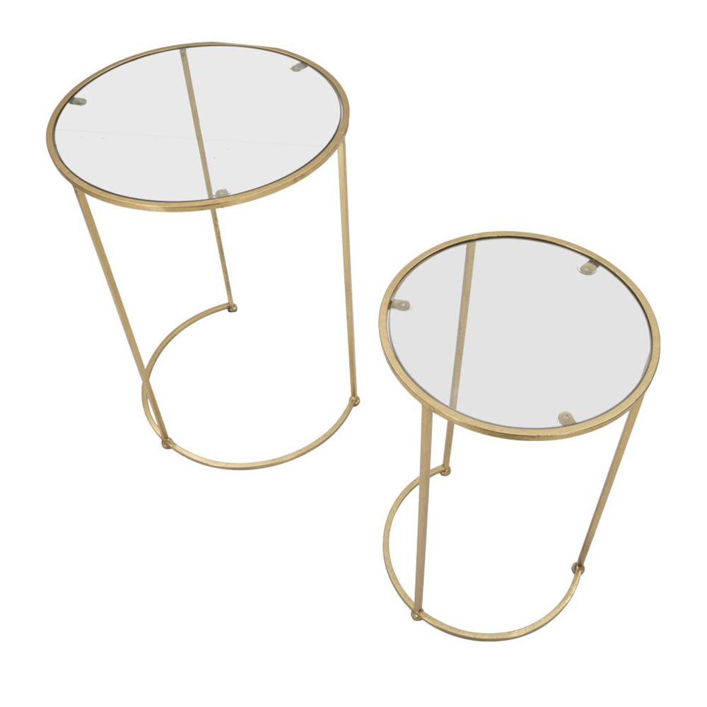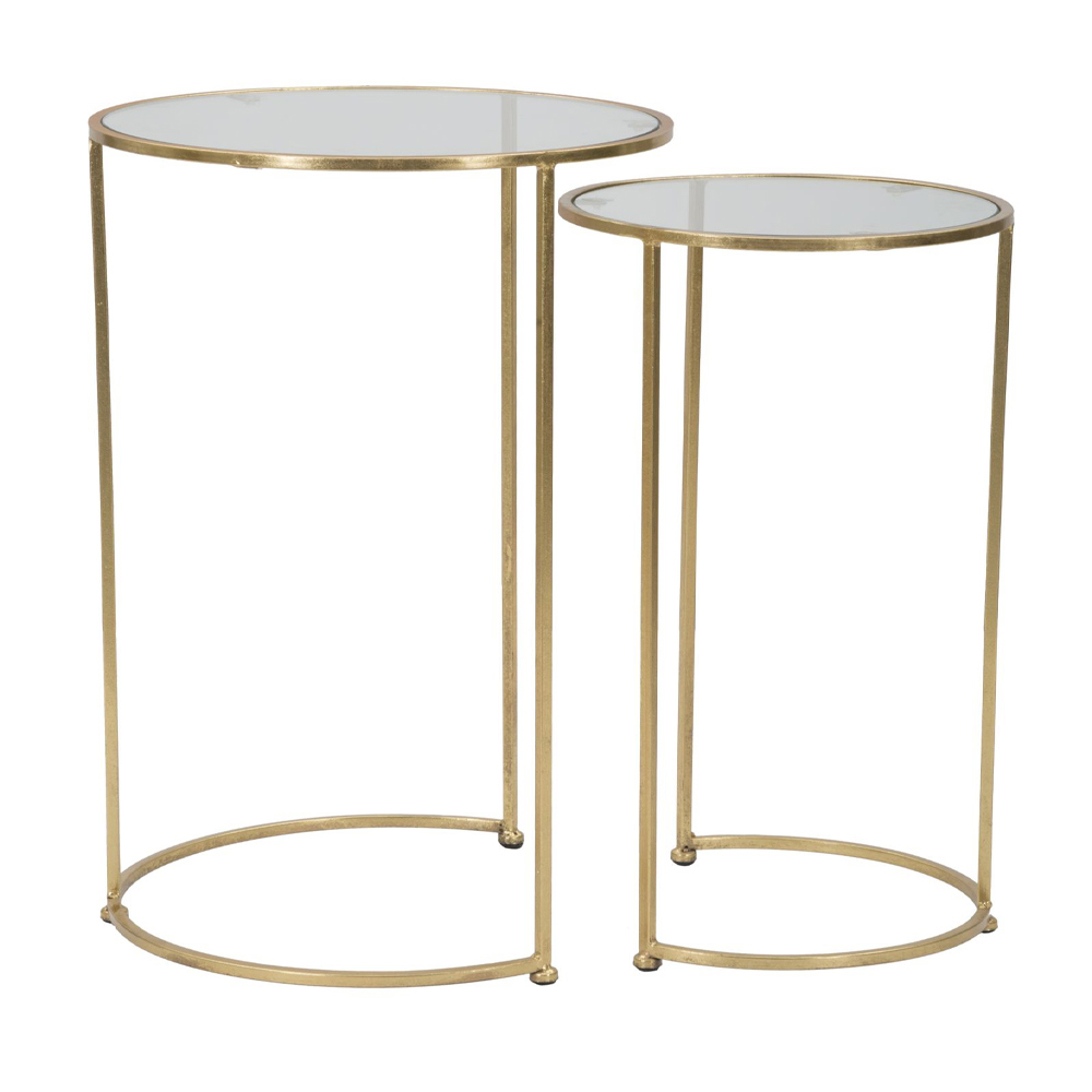 Ett par soffbord i förgyllt järn med rund glasskiva.