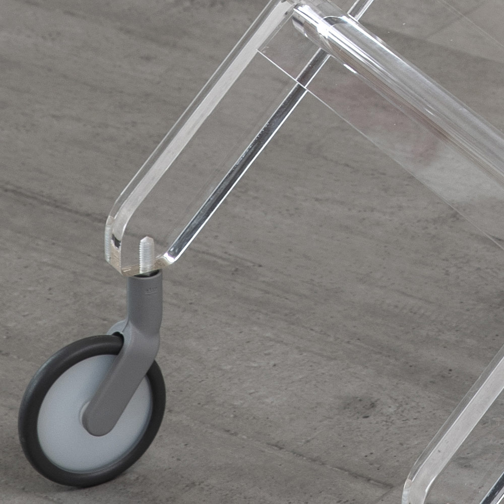 Fällbar vagn i transparent akryl med tillverkade i Italien designhjul.