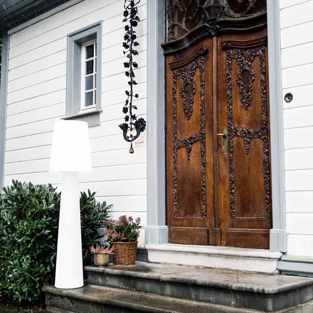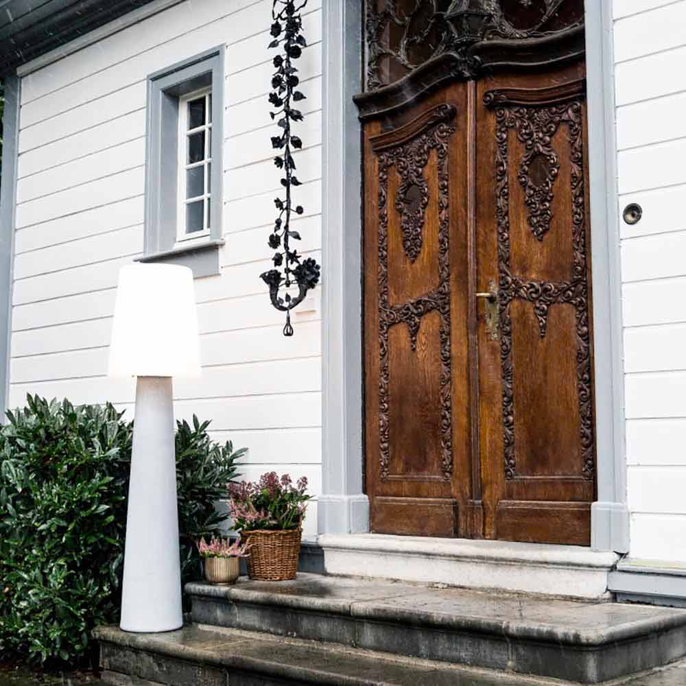 Denna golvlampa kännetecknas av en modern och tidlös design som kan skapa en perfekt och elegant atmosfär både inomhus och utomhus .