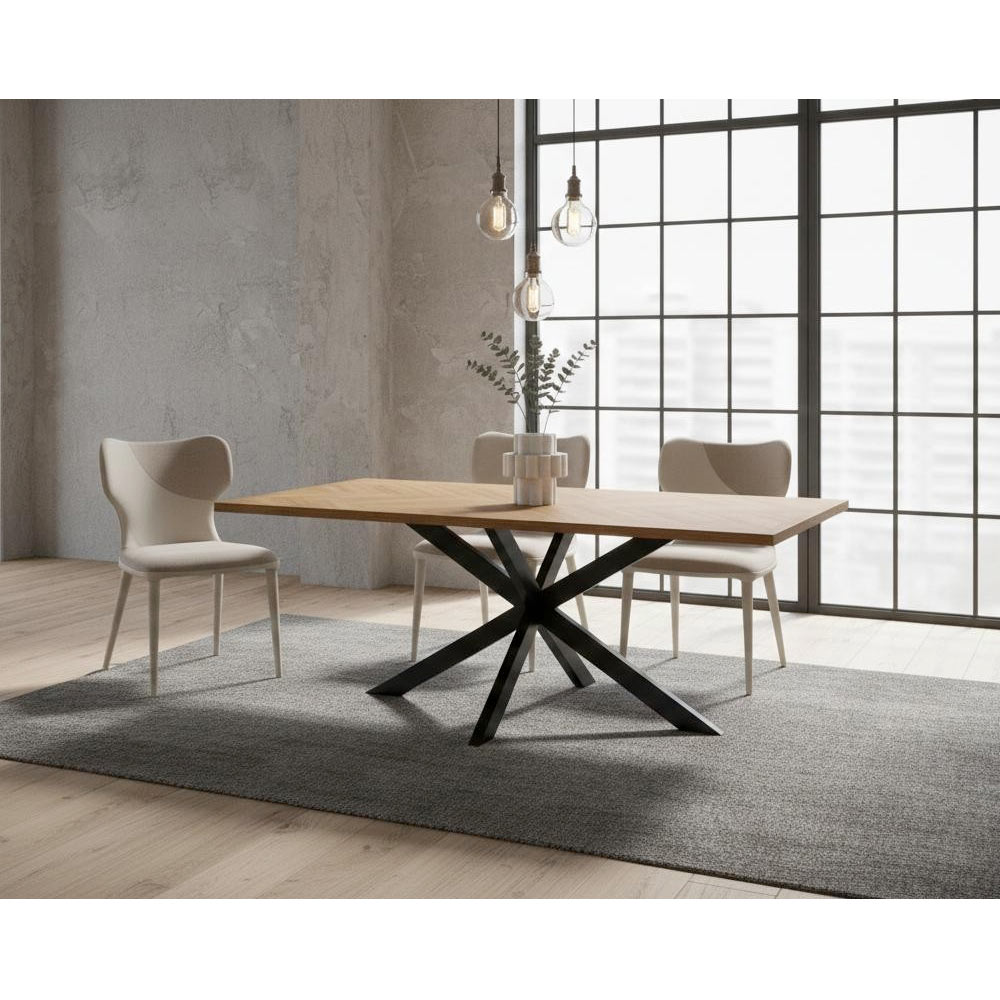 Den solida järnramen säkerställer stabilitet och hållbarhet, medan den distinkta designen av de korslagda benen ger en modern, dramatisk touch, perfekt för moderna, industriella eller minimalistiska miljöer.