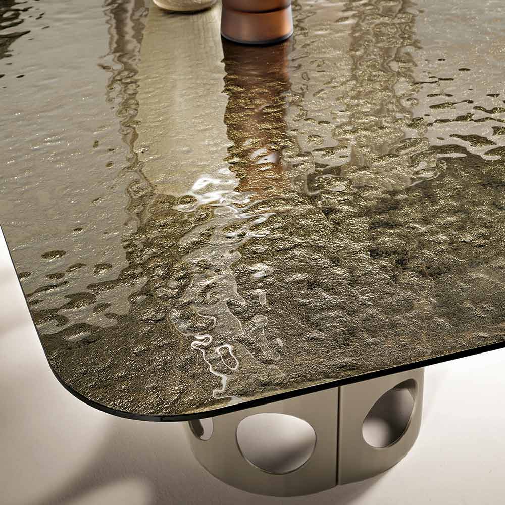 Den hamrade glasskivan ger bordet djup och personlighet tack vare dess unika texturerade finish som reflekterar ljus i ett oregelbundet mönster, vilket skapar slående visuella effekter. Denna process gör varje yta dynamisk och förfinad, vilket förstärker produktens moderna design.