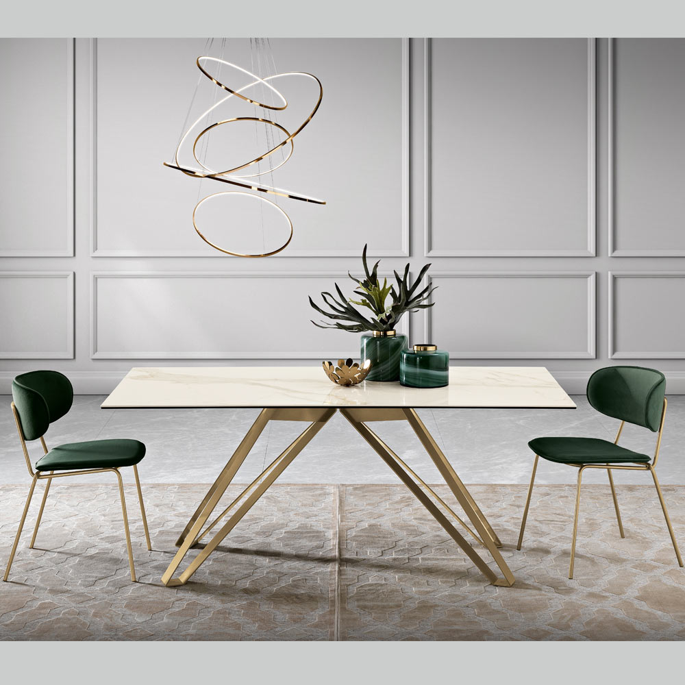 Detta bord är imponerande i sin kontrast av material och färg och är ett sant uttryck för lyx och modern design. Den glaskeramiska toppen i calacattamarmoreffekt med delikata nyanser är en hyllning till naturlig elegans, motståndskraftig och samtidigt extremt raffinerad.