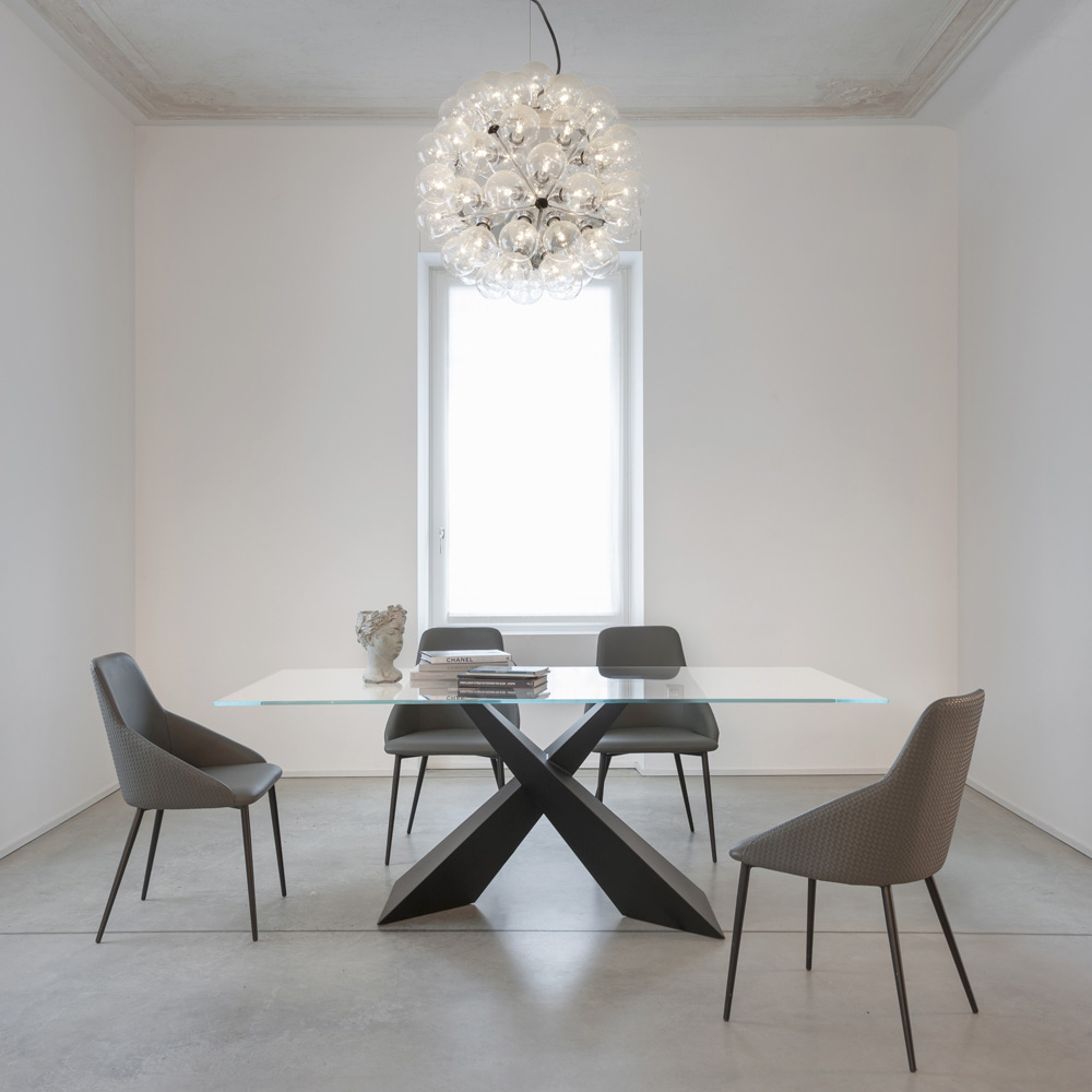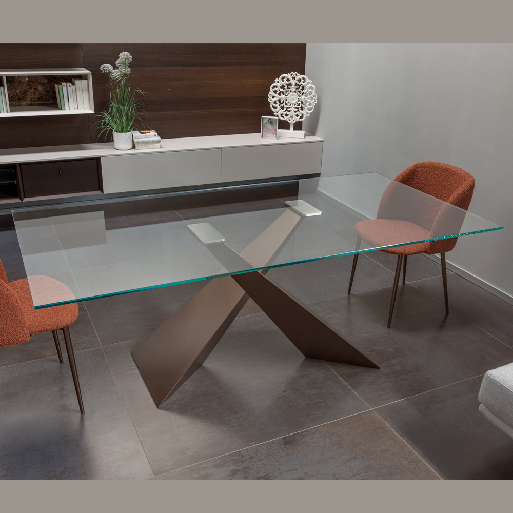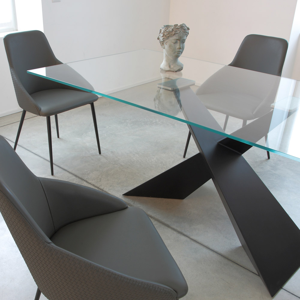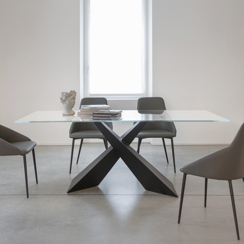 Den absoluta huvudpersonen är den korslagda basen i målad metall , med en geometrisk och dynamisk design. De avgörande linjerna skapar en skulptural och arkitektonisk effekt som förvandlar bordet till ett verkligt möbelelement.