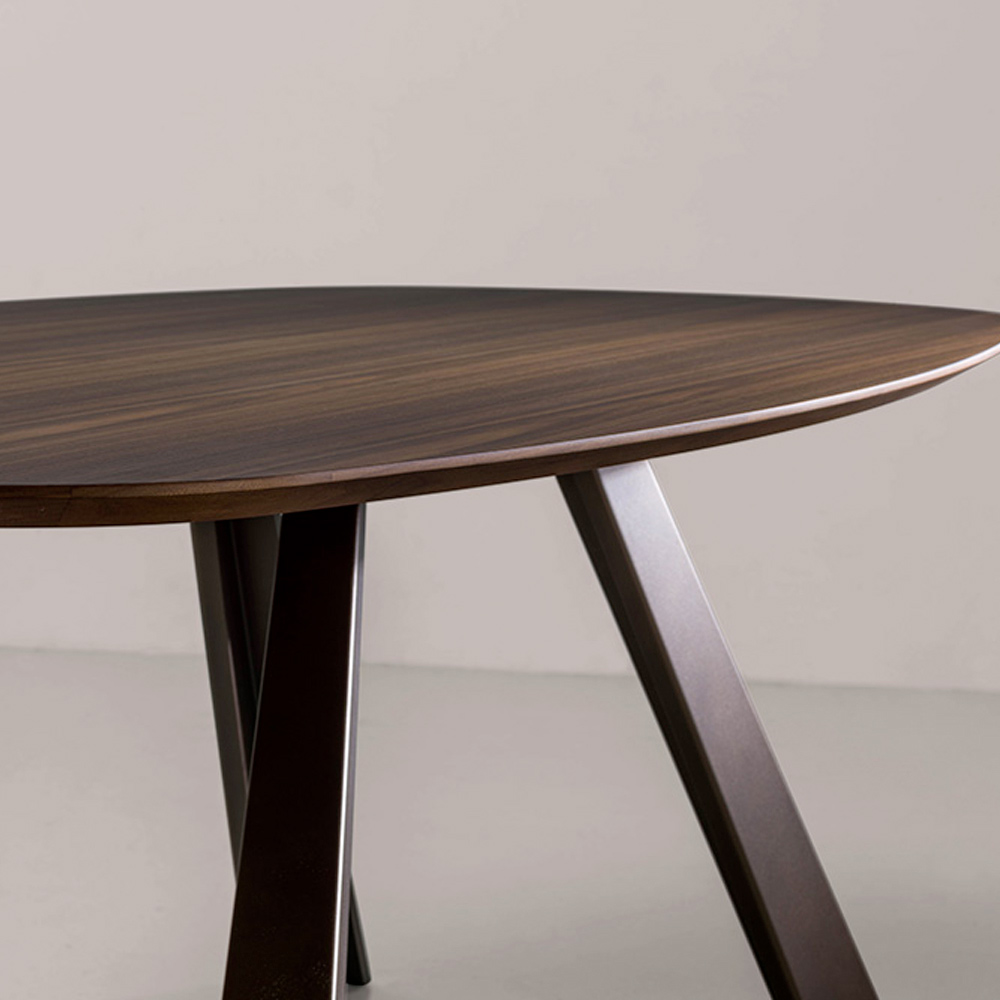 Fast bord med elliptisk fasad skiva i eukalyptusfanerad blockboard och ben i lackerad metall med bronsfinish . Fasad överkant Mått H 77 cm, tjocklek 3 cm.
