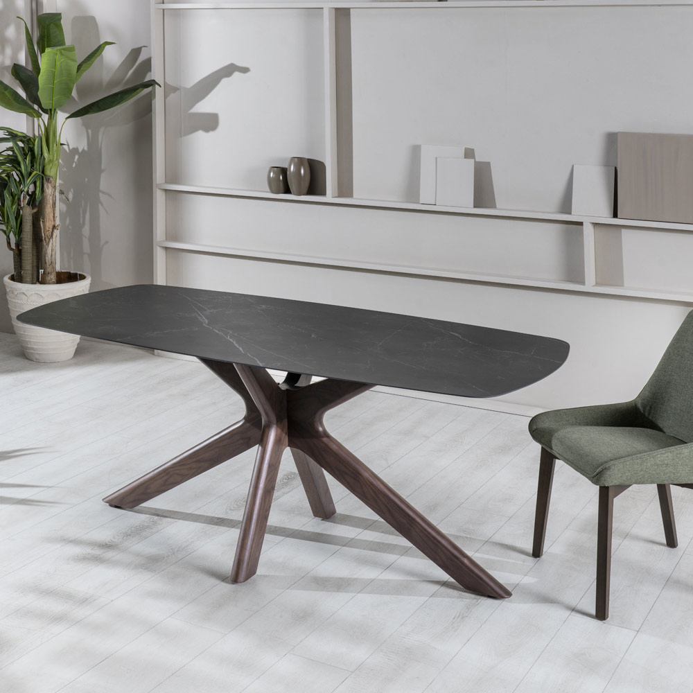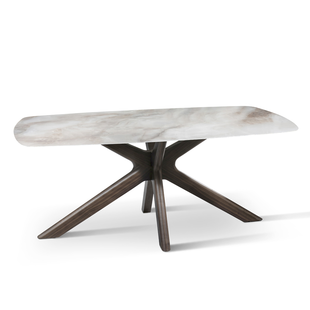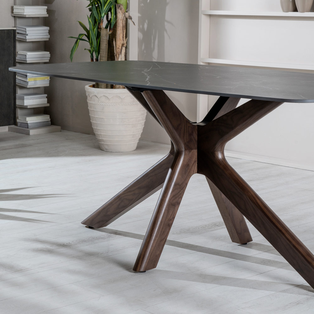 Det är ett raffinerat och originellt bord, där flytande och mjuka linjer leker med varandra och skapar detaljer med stor visuell styrka. Den keramiska toppen vilar delikat på den stjärnformade basen, gjord av massiv valnöt. Resultatet av forskning som utforskar de mest olika stilar och inspirationer, det är en sann huvudperson i vardagsrummet, som passar harmoniskt både in i miljöer med modern design och i utrymmen som gynnar lyx och klassisk stil.