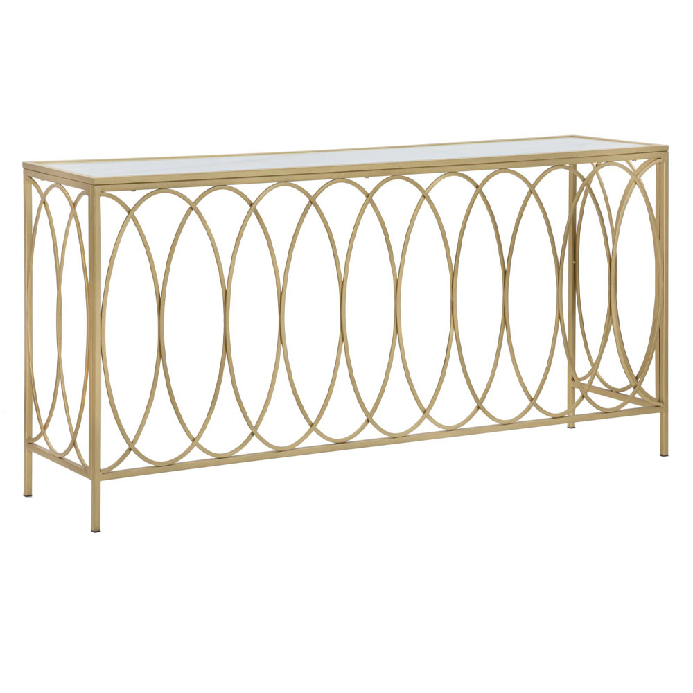 Fast konsol för entré eller vardagsrum med struktur av järn med guldfinish och vit marmoreffektglasplatta . Ett komplement som kännetecknas av enkla och mångsidiga linjer och former som gör denna konsol till en möbleringslösning som passar alla moderna stilsituationer. Dess särdrag är den underbara geometriska konsistensen som kännetecknar hela produktens struktur, vilket ökar dess värde och unikhet tillsammans med den raffinerade toppen i marmoreffekt som understryker dess sofistikerade estetik .